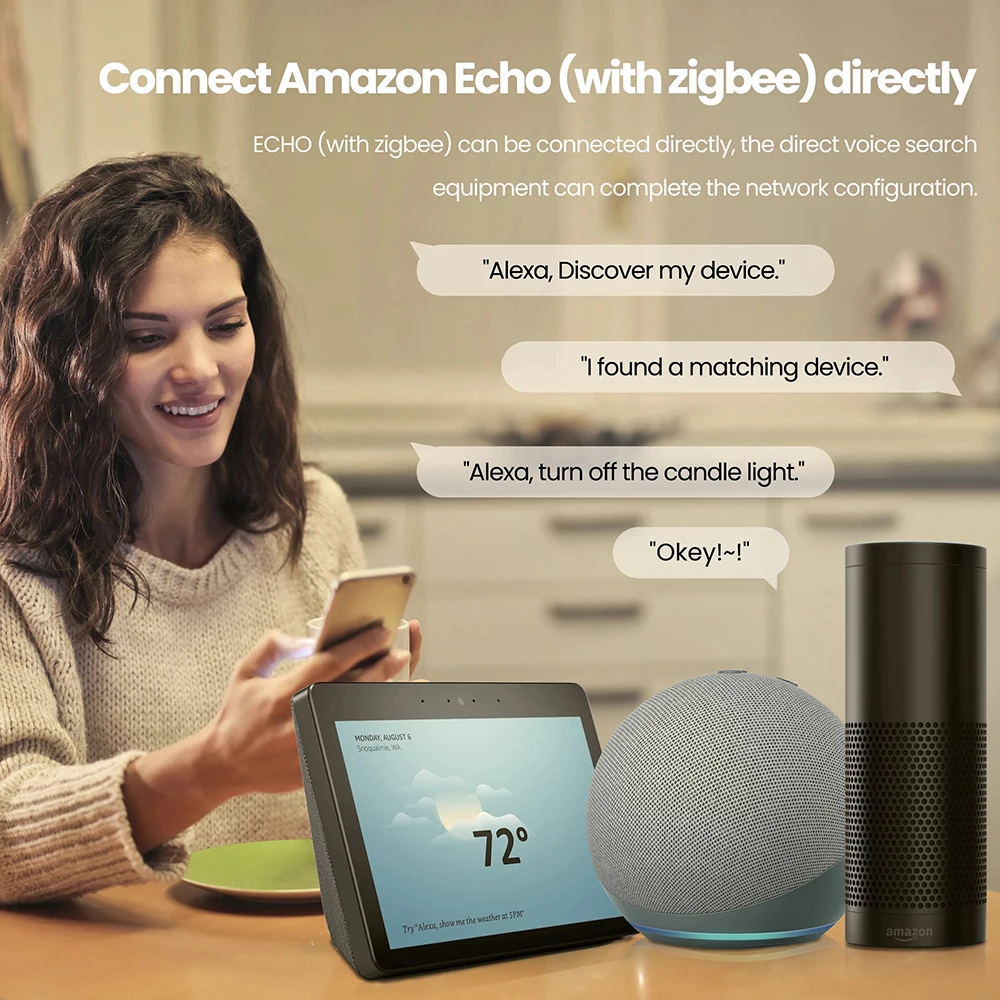 Стабильный протокол подключения Zigbee 3,0.Совместим со стандартным шлюзом H * ue/Tuya/для Smartthings/Echo Plus и Zigbee 3,0.Подключение непосредственно эхо (с zigbee)Легко создавать окружающее освещение для вечерниеУмное Голосовое управление, дистанционное управление с помощью приложенияНесколько режимов на выборФункция семейного обмена, функция таймераМногоцветная Регулируемая и диммируемая