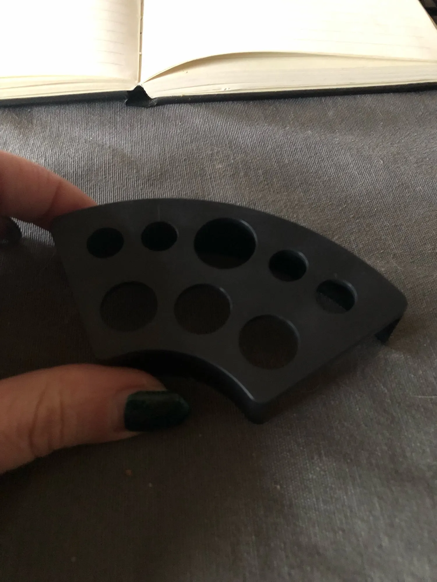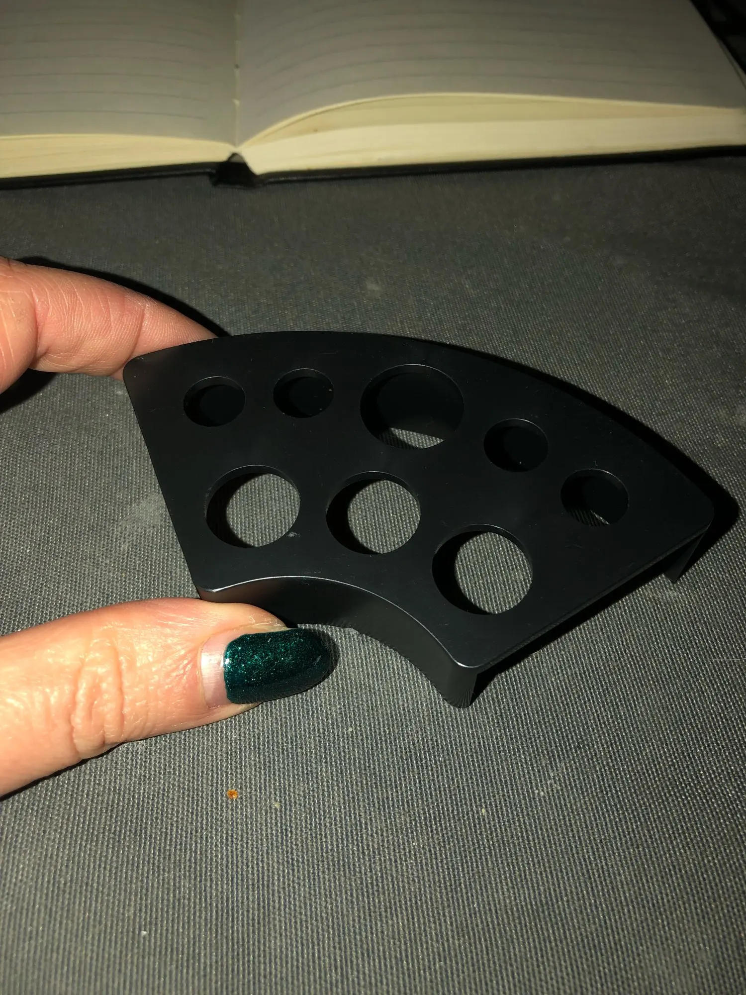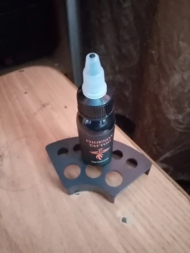 Подставка простенькая, но удобная, чтобы ставить колпачки для краски любого диаметра. Благодаря этой подставке, колпачок не падает при наборе пигмента, если сравнивать с тем, что стоя на столе (без подставки), он может опрокинуться и содержимое пролиться.