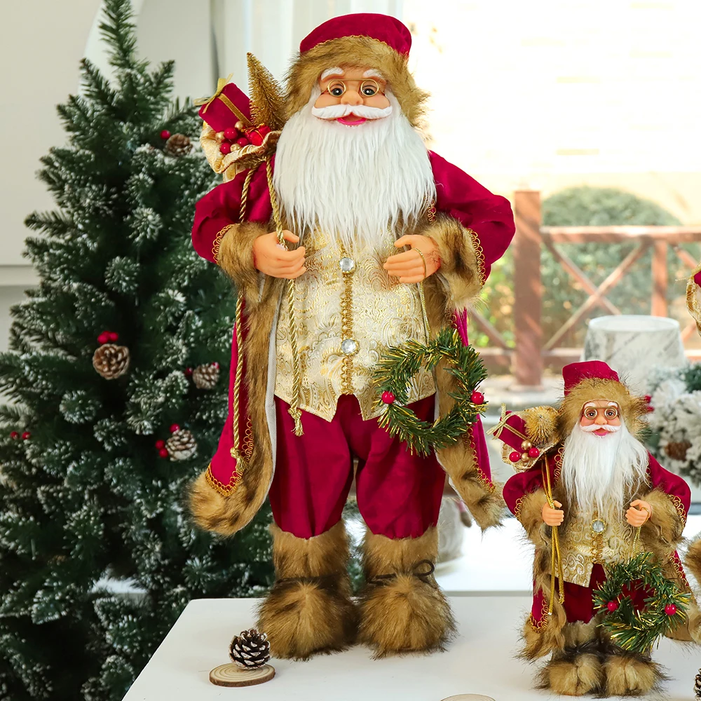 Санта 45 см. Отправка и доставка, довольно быстро. Но по факту цвет не такой насыщенный и штаны зелёные. Упаковано в пакет, что привело к заломам на руках Санты, замят колпак, венок и мешок. Пластик мягкий, вроде выпрямился, но уже не то, как на фото. Декорации венка обломились. Очки, не понятно, или не от этого размера, или обломаны, никак не удаётся поставить и приклеить. Для таких фигурок должна использоваться жесткая упаковка.