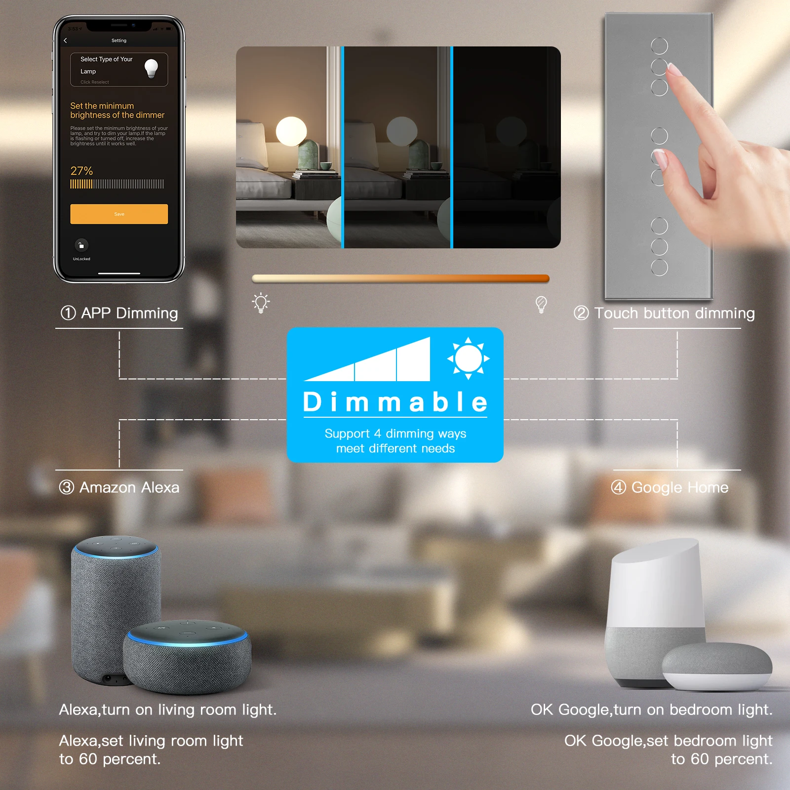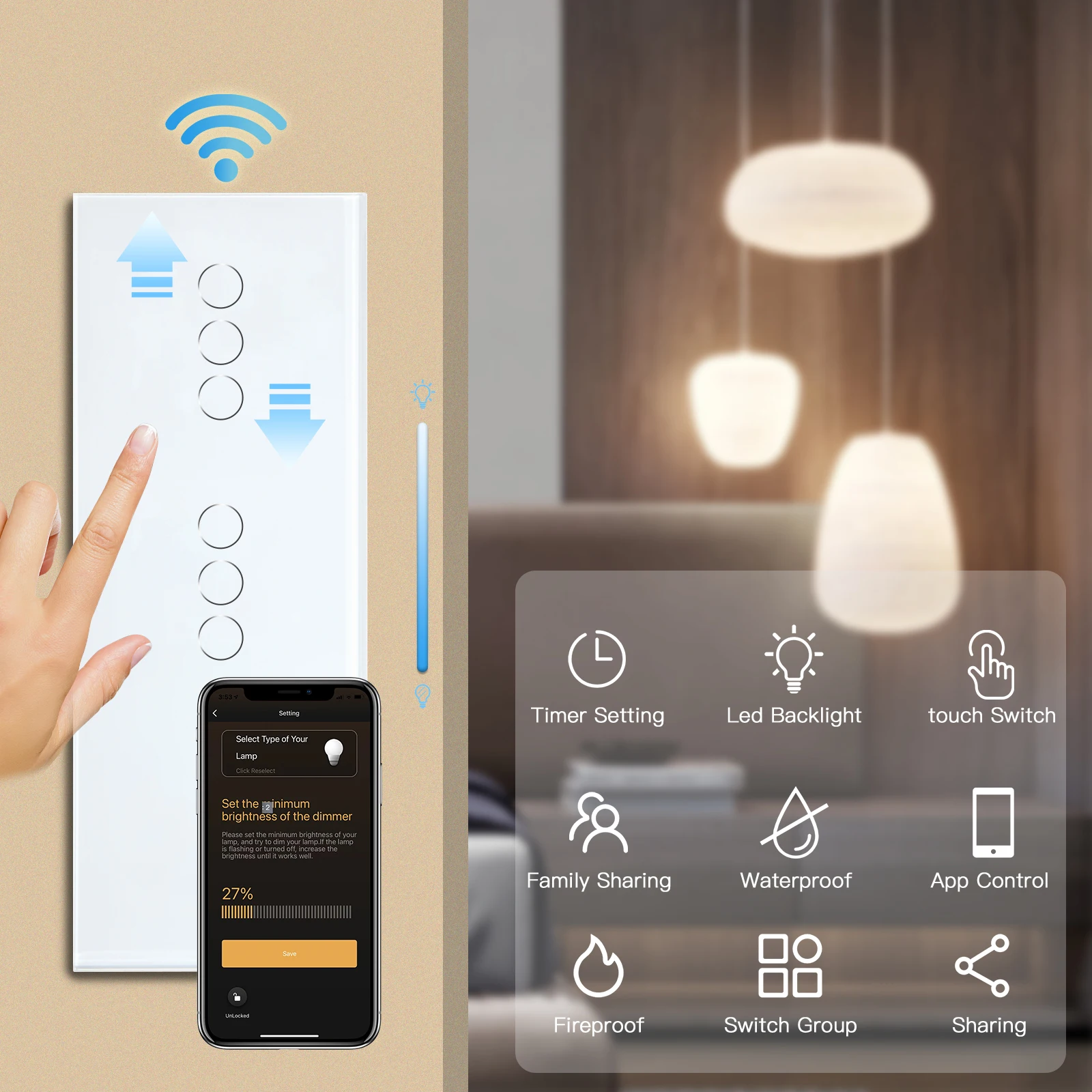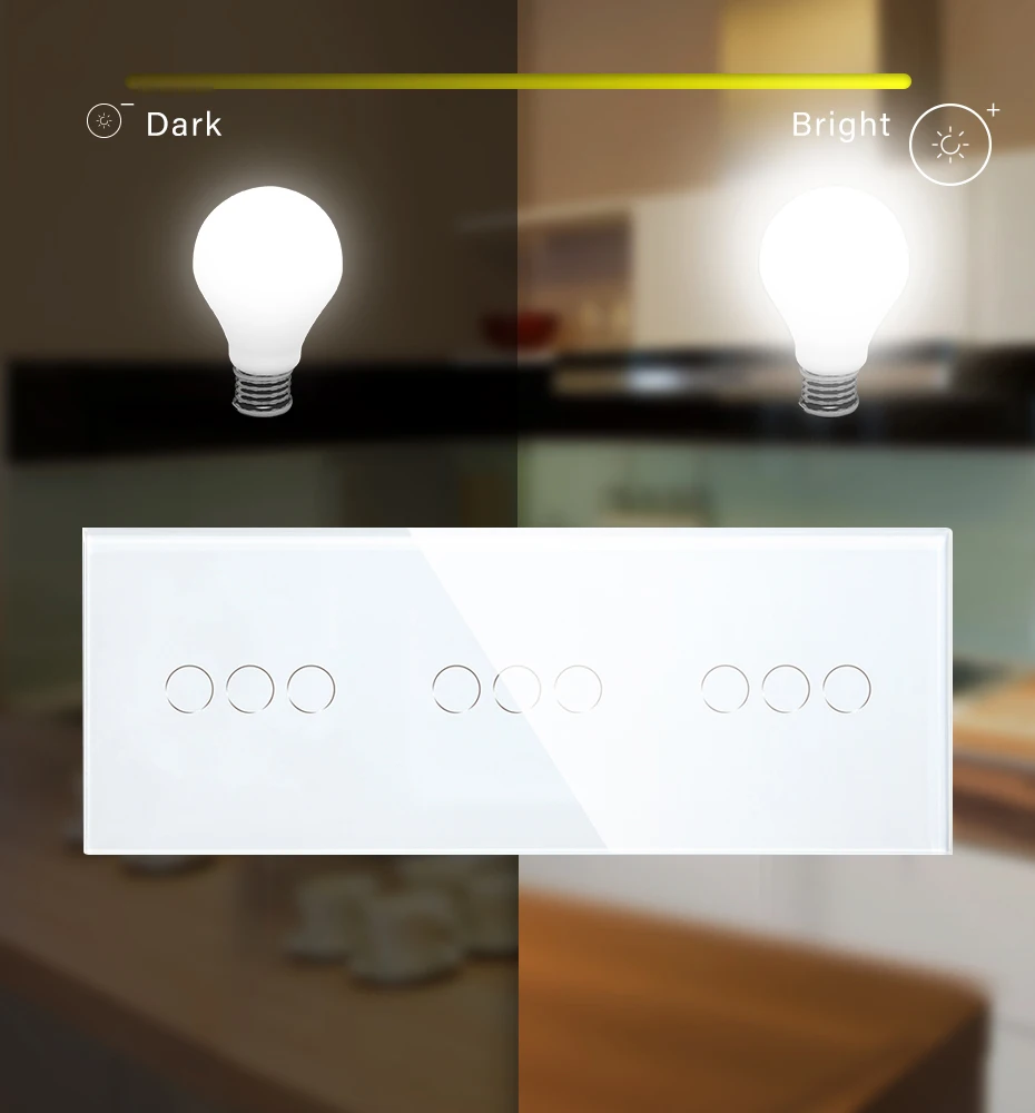 6. Диммер может использоваться для включения/выключения света или тусклых колготок. И вниз (Управляйте яркостью света), прикоснувшись к передней стеклянной панели диммера. Обычно светодиодный светильник с регулируемой яркостью идеально используется, светодиодный адаптер может устранить 99% мерцания.