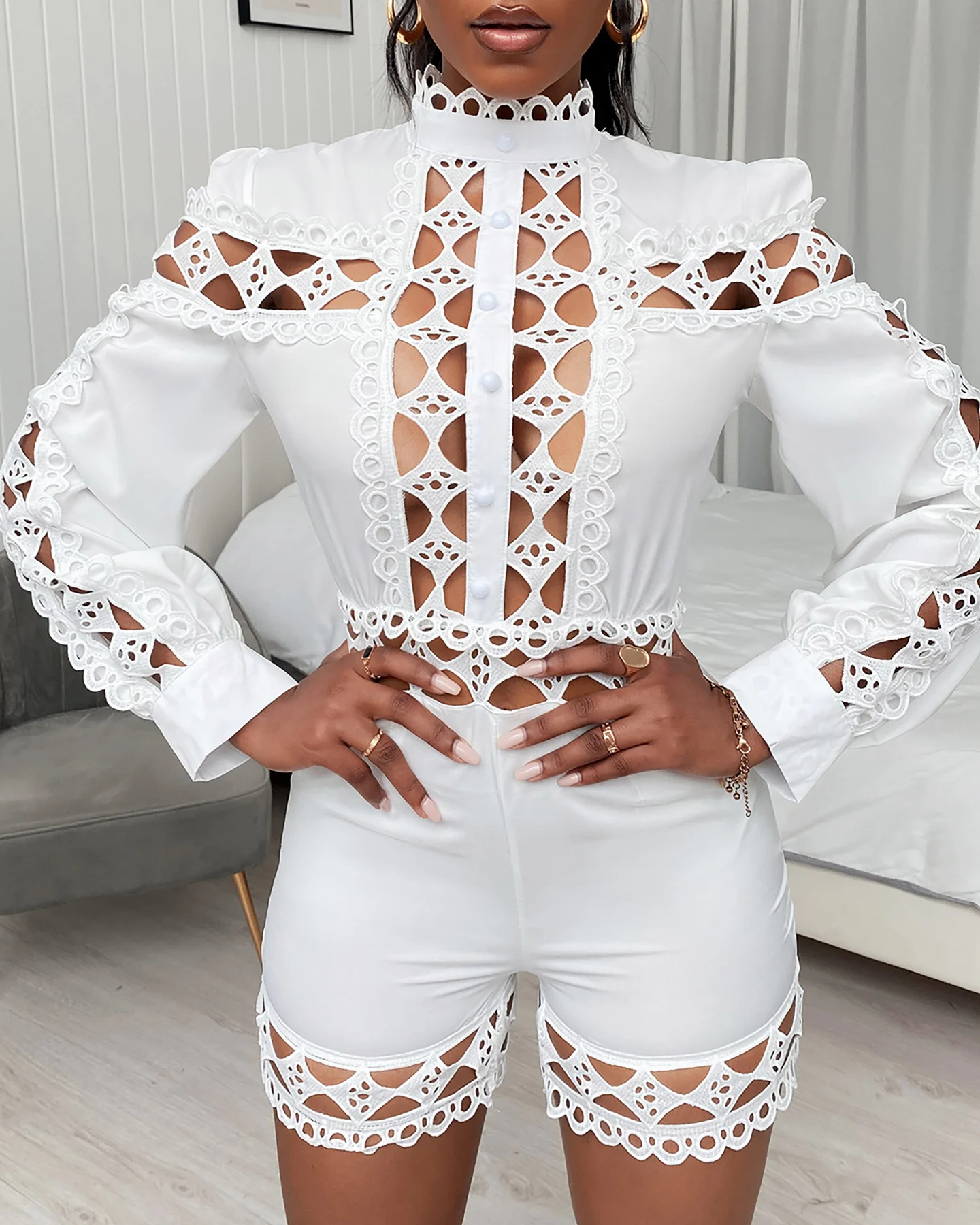 Женский короткий комбинезон, кружевной комбинезон с высоким воротни...