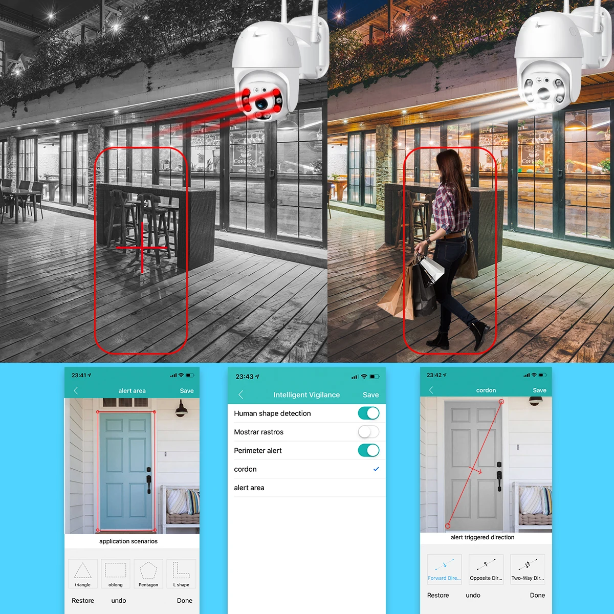 Поддерживает интеллектуальную систему идентификации, эта камера может обнаруживать движение и движение человека, затем, нажмите на будильник и уведомления на ваш телефон