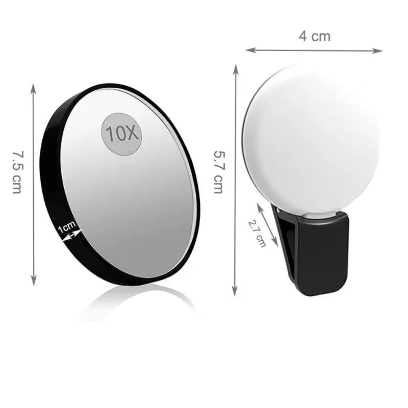 Продукты включают: 1 * Светодиодный заполняющий светильник с зажимом, 1*10 увеличенное круглое зеркало на присоске, 1 * 3-стороннее зеркало