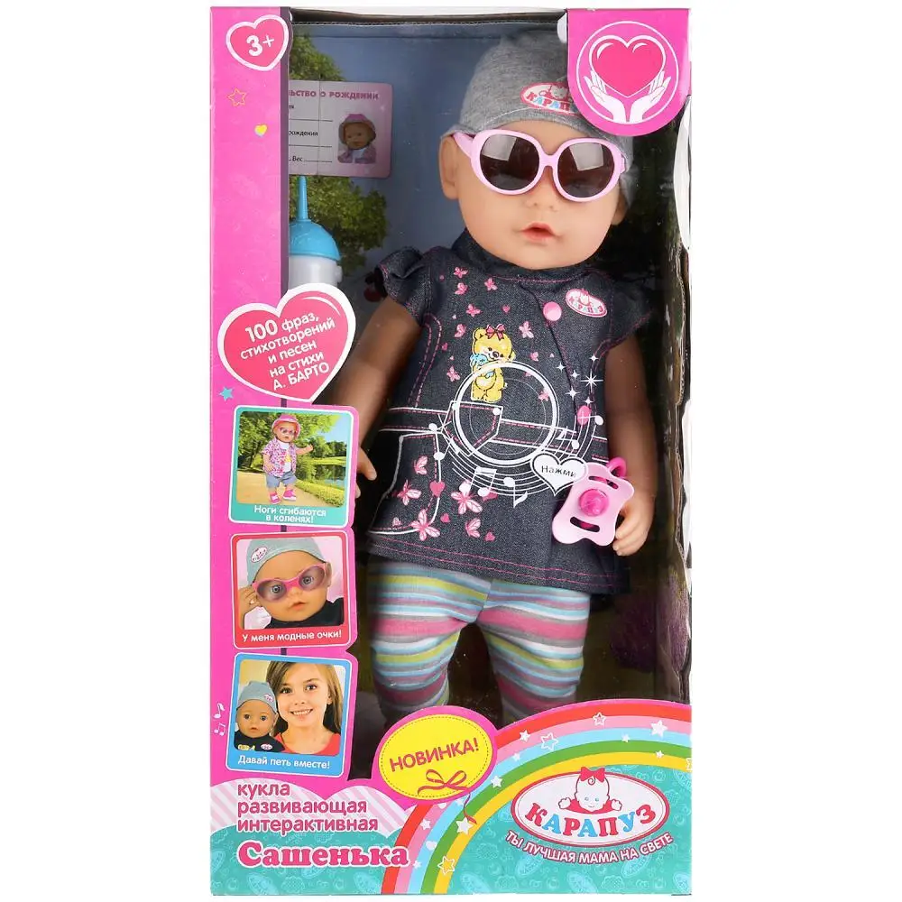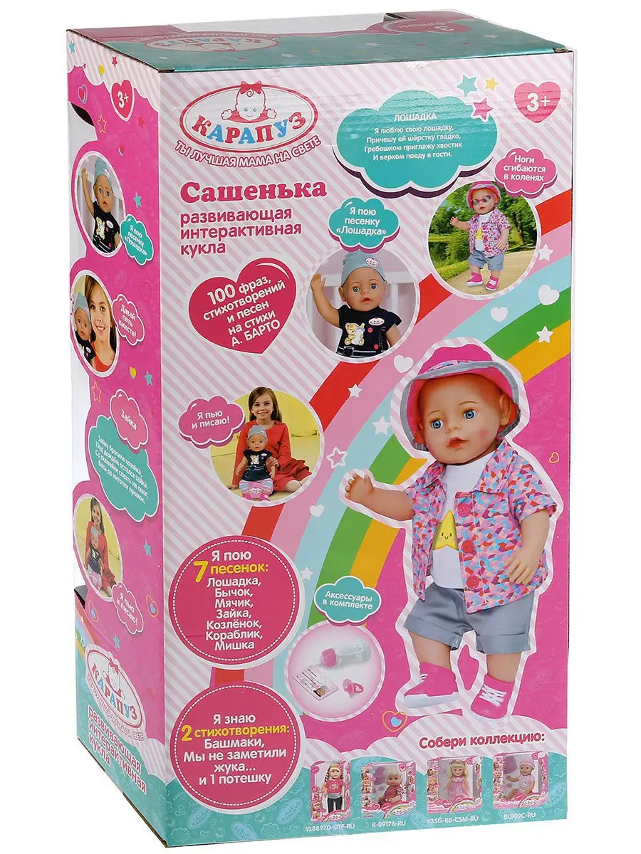 Развивающая Интерактивная кукла «Сашенька» ТМ «Карапуз»-озвученная игрушка, говорящая и Поющая стихи и песни на стихах А. Барто: «Лошадь», «мяч», «бык», «Медведь», «Коза», «корабль», «кролик». Модный комплект sachenka: шорты, футболка с рисунком звезд, куртка, кепка и обувь (легко снимать и надевать). Лицо куклы детально.Игра с интерактивной куклой позволяет строить Сюжетно-ролевые линии и развиваться:-Восприятие звука и музыкальный звук-Необычный-Зарядка-Чувство моды-ПамятьС куклой ТМ «Карапуз» девочка вырастет заботливой мамой.Характеристики:Возраст-от 3 летРазмер-45 смФункции-напитки из бутылки, пищат, поют, говорят 100 фраз, ноги согнуты в коленяхУпаковка-коробка с окномМатериал-пластик/ТекстильBatteries-CR2032 1 шт. (в комплекте)Упаковочный лист:Поплавок,Одежда,Маленькая бутылка,Соска,Солнцезащитные очки