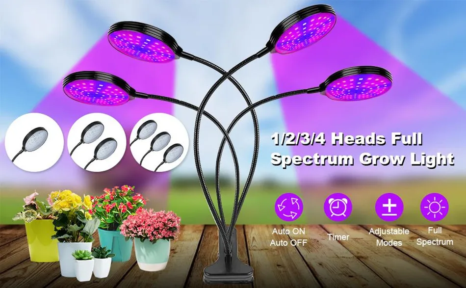 Фитолампа полного спектра для выращивания растений, LED полосветильник с 4 головками, 60 Вт, с таймером, 5 в постоянного тока