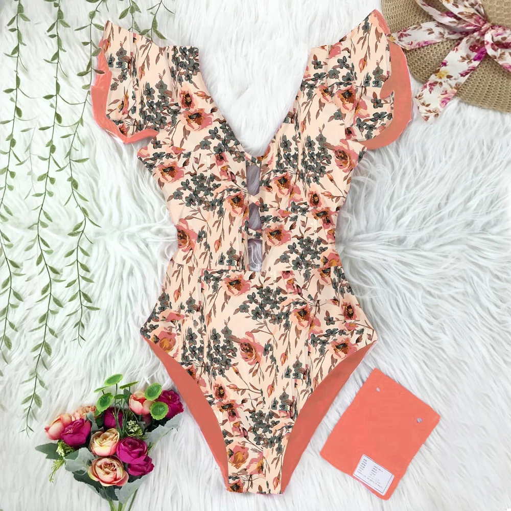 Цельный купальный костюм 2021, сексуальная купальная одежда с оборками, женский купальный костюм с V-образным вырезом, пляжная одежда, монокини с цветочным принтом для плавания