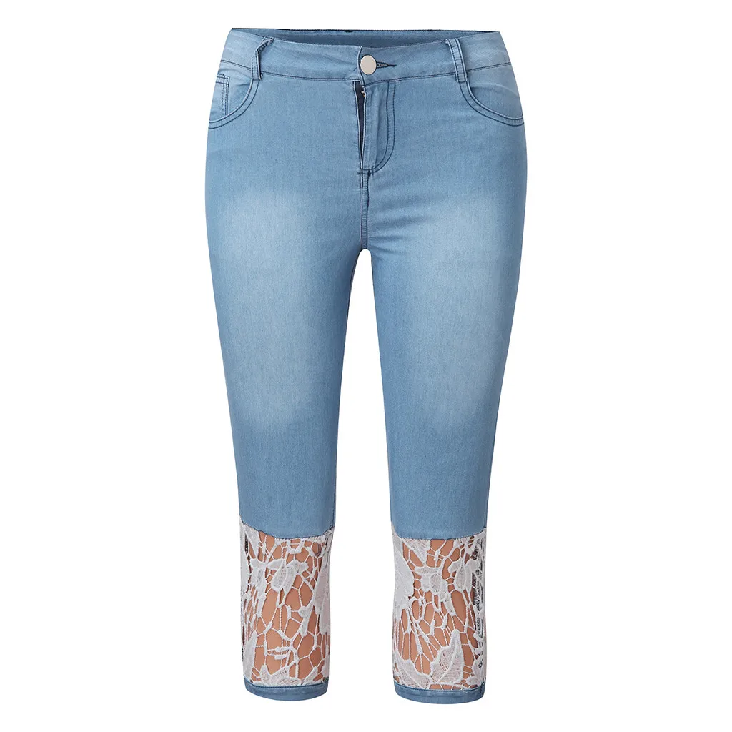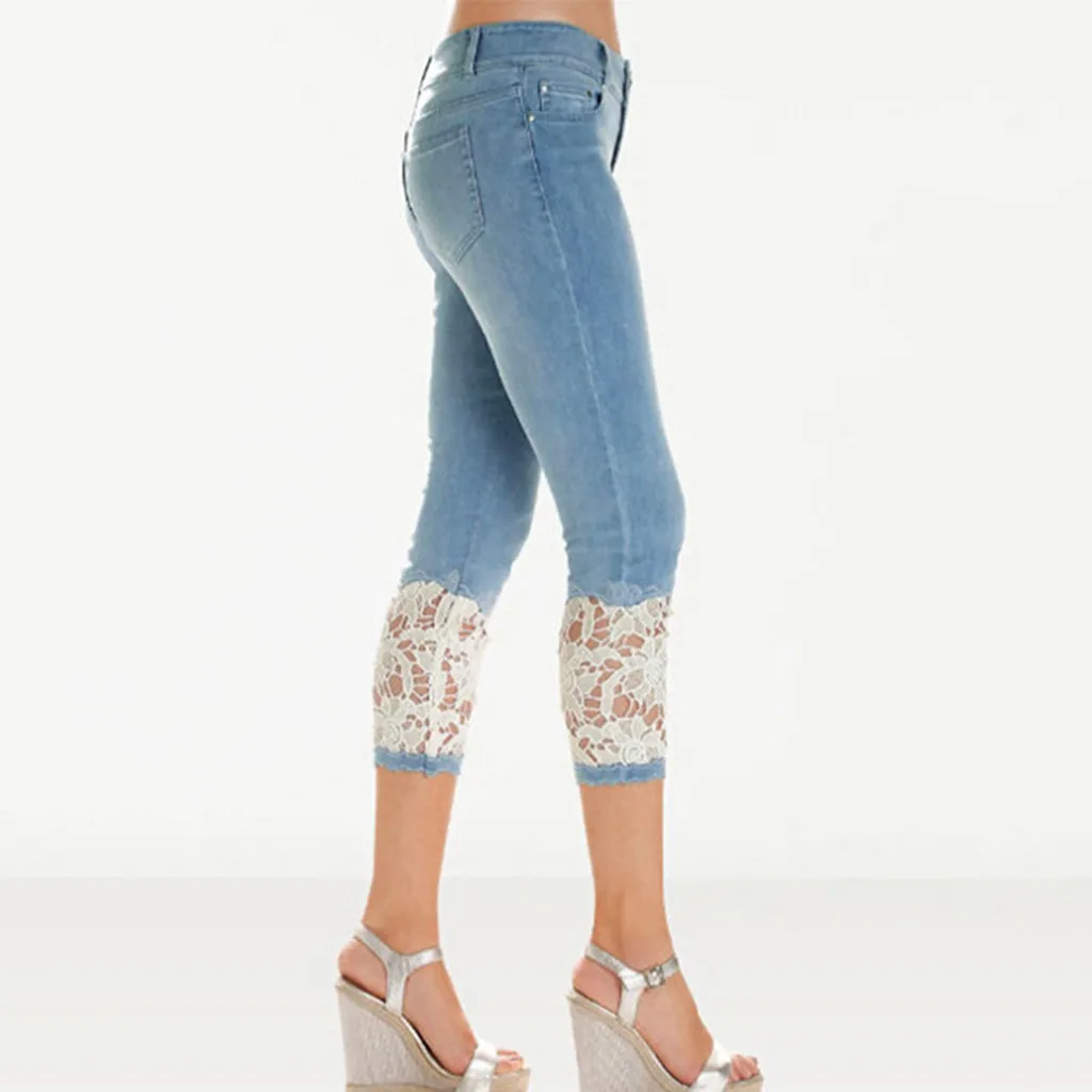 Брюки женские эластичные кружевные из денима, повседневные укорочен...