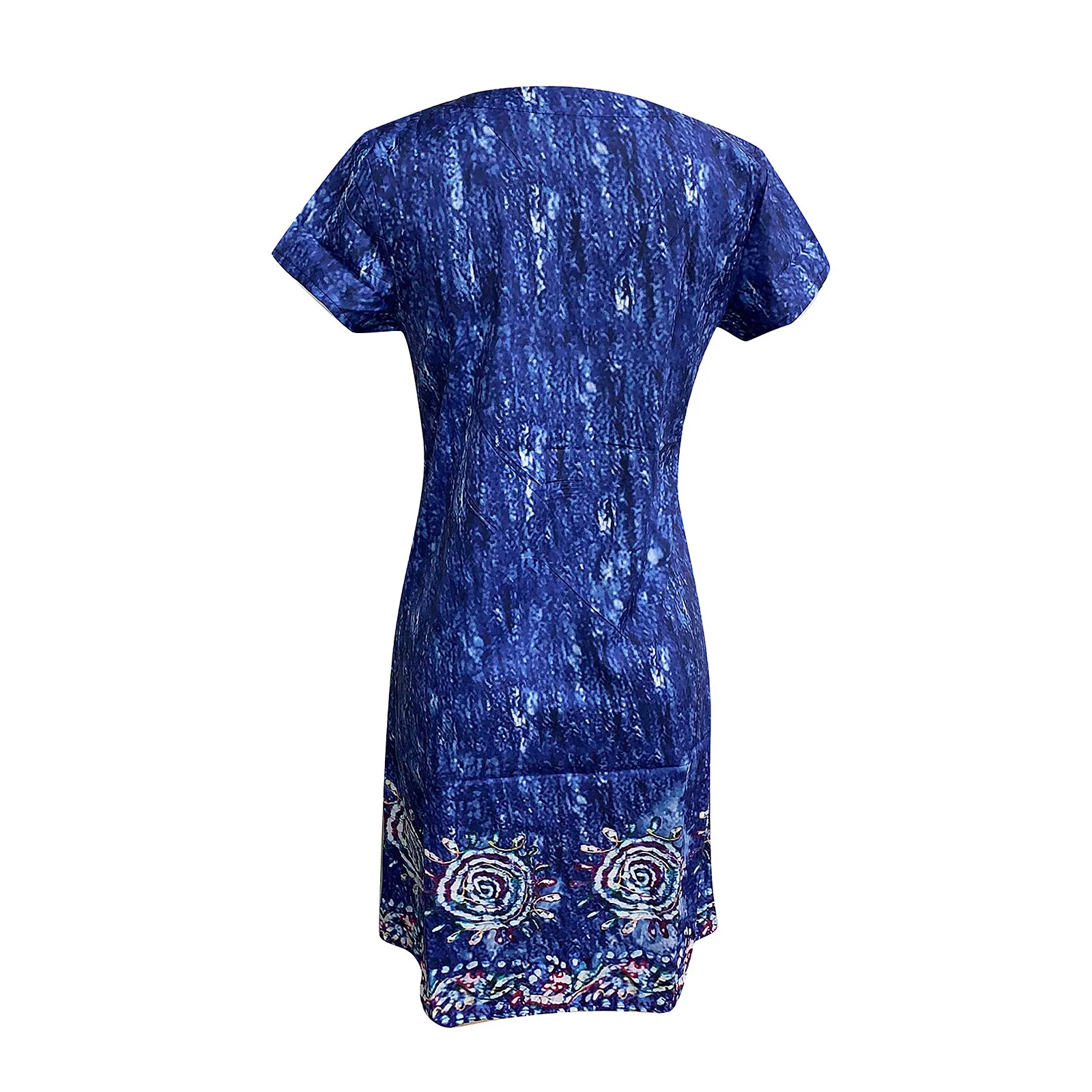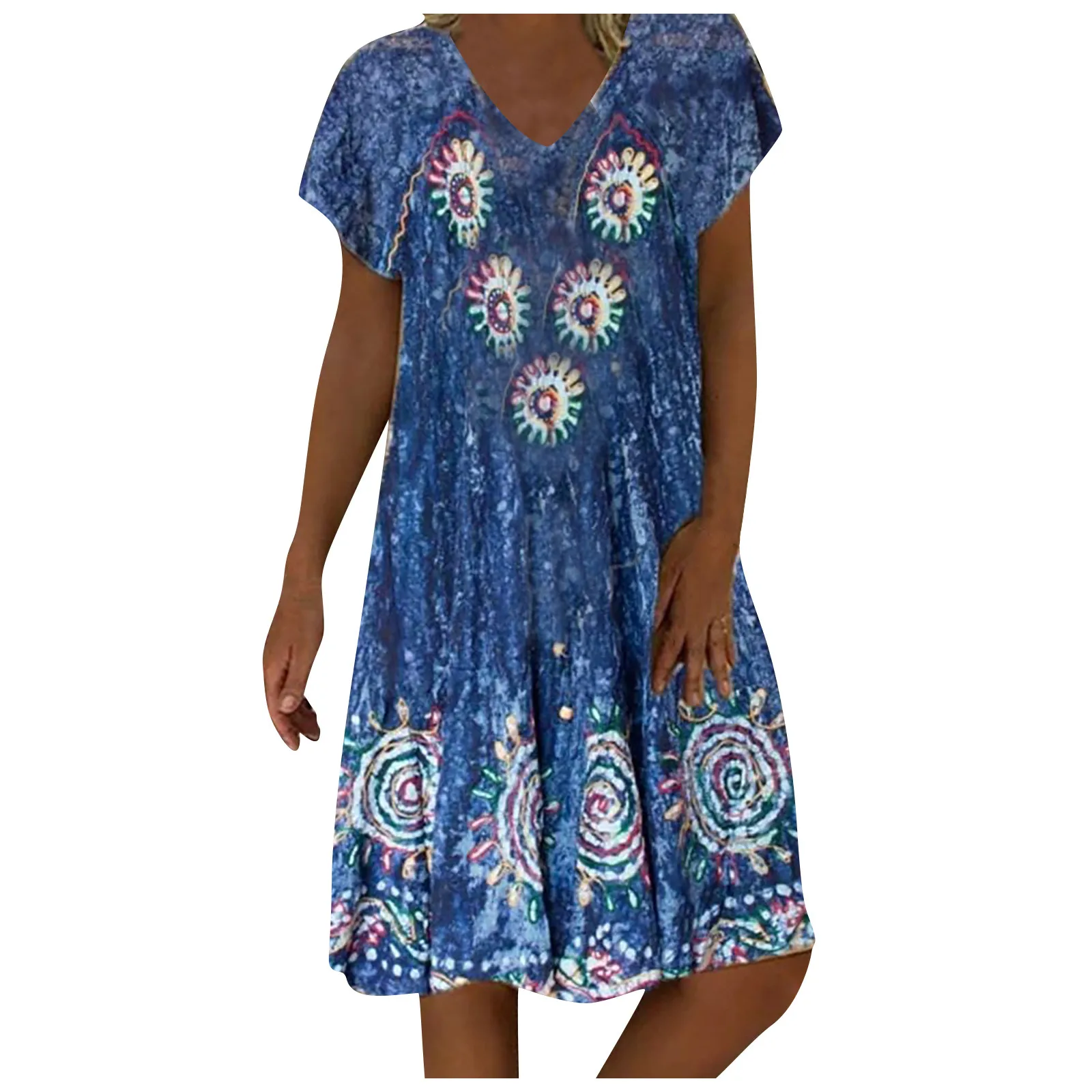 Женское летнее платье до колена, свободное винтажное платье с V-образным вырезом и коротким рукавом, с принтом в богемном стиле, 2021