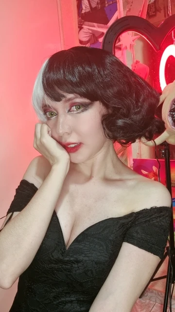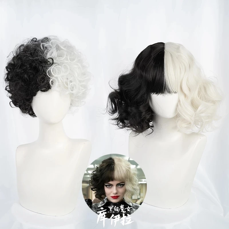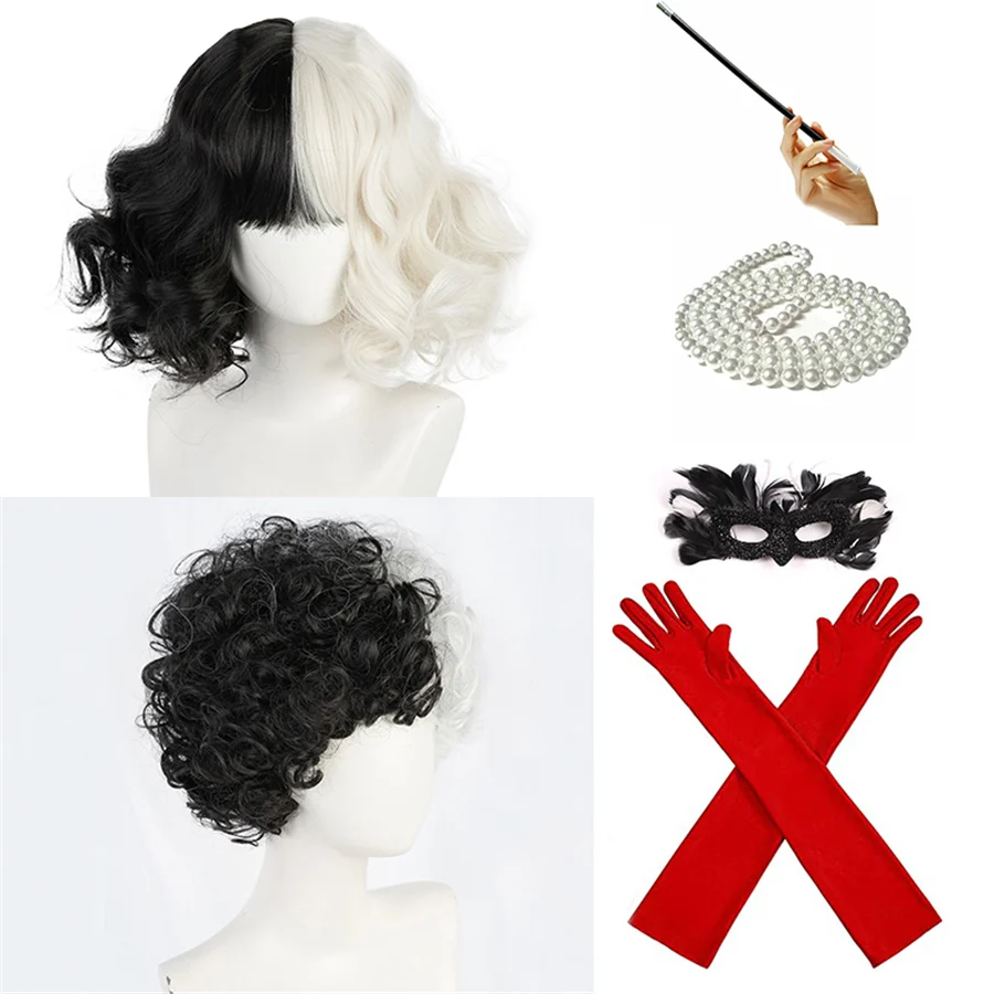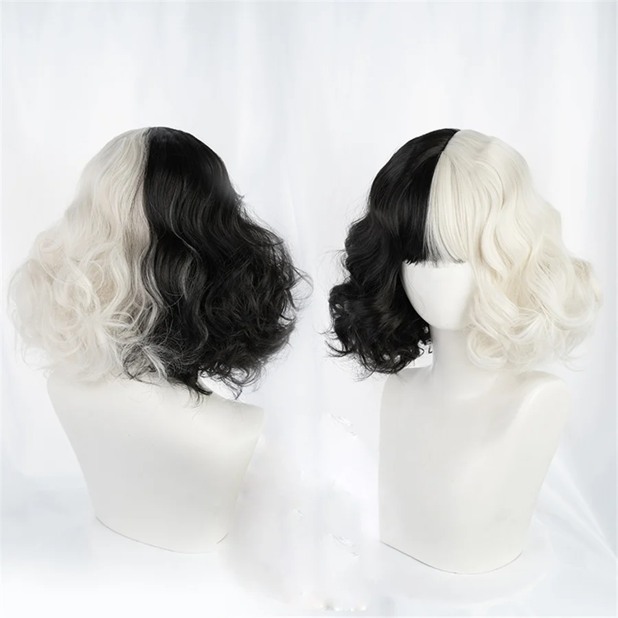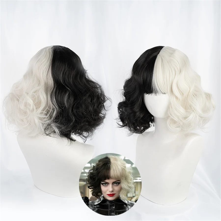 Парик для косплея CRUELLA Deville De Vil, термостойкий, с короткими волосами, с челкой, для Хэллоуина, вечевечерние, с шапочкой
