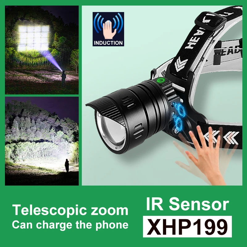 Супер мощный налобный фонарь XHP199, фонарики 18650, перезаряжаемый светодиодный налобный фонарь с ИК-датчиком, налобный фонарь для рыбалки XHP90, налобный фонарь