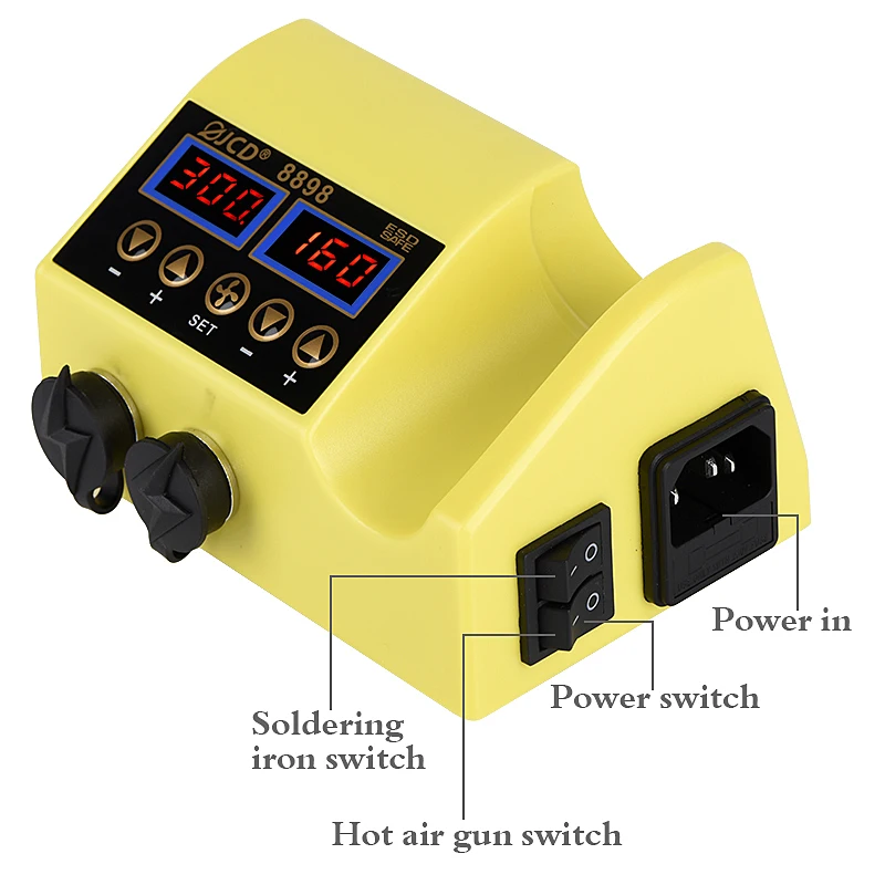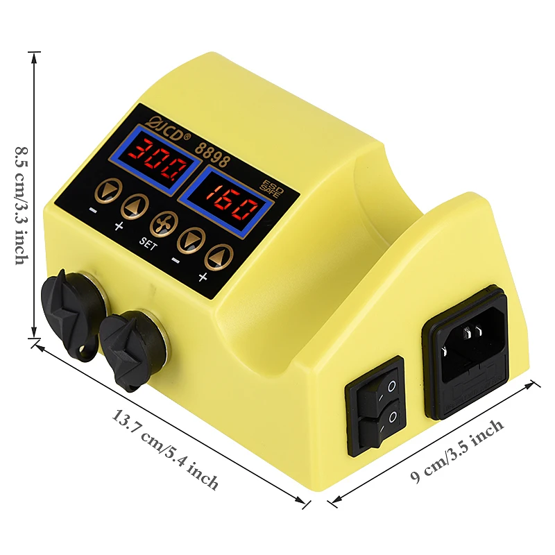 Нагреватель горячего воздуха и сварочный Утюг 2в1 паяльная станция. Двойные цифровые ЖК-дисплеи для отображения точной температуры. Чрезвычайно низкий уровень шума и компактный дизайн. Функция интеллектуального самообнаружения обеспечивает безопасную персональную работу. Функция автоматического охлаждения для эффективного продления срока службы нагревателя и защиты нагревателя горячего воздуха. Пистолет горячего воздуха Рабочее напряжение: AC220-240V или AC100-130V Частота: 50 Гц/60 Гц Выходная мощность: 800 Вт Диапазон температур: 100 °C ~ 480 °C Стабильность температуры: ± 2 ℃ Поток воздуха: 150 л/мин (макс.) Паяльник Рабочее напряжение: AC220-240V или AC100-130V Выходная мощность: 80 Вт Частота: 50 Гц/60 Гц Диапазон температур: 180 °C-500 °C Стабильность температуры: ± 1 °C Паяльник: дизайн ESD Материал нагревателя: керамика Как использовать: 1. Очистите электронные компоненты для пайки. 2. Как только железо достигнет температуры (не слишком высокий, рекомендуется 300-450 ℃). 3. Нанесите немного припоя на нагреваемый железный наконечник, чтобы предотвратить окисление, затем протрите железный наконечник, чтобы равномерно продлить припой на поверхность железного наконечника. 4. Начните паять
