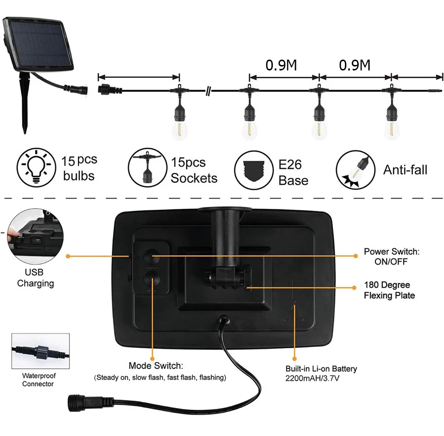 Уличная светодиодная гирлянда S14 для внутреннего дворика, праздничный садовый шнурок на солнечной батарее для патио, праздничное освесветильник для беседки, террасы, кафе, бистро, 1015 светодиодный