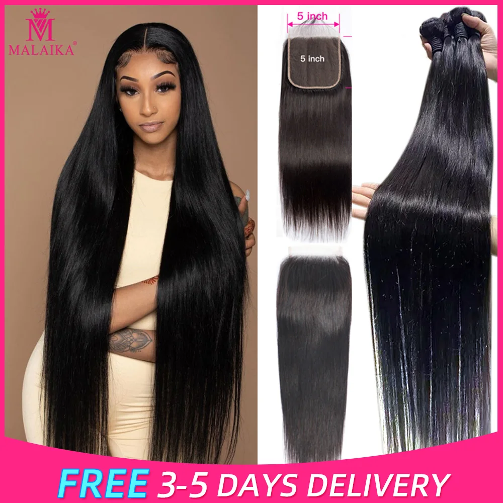 Волосы Malaika 30 32 34 40 дюймов прямые бразильские пучки волос с застежкой HD кружева 5x5 кружевные пупряди волос 3 шт. с кружевом