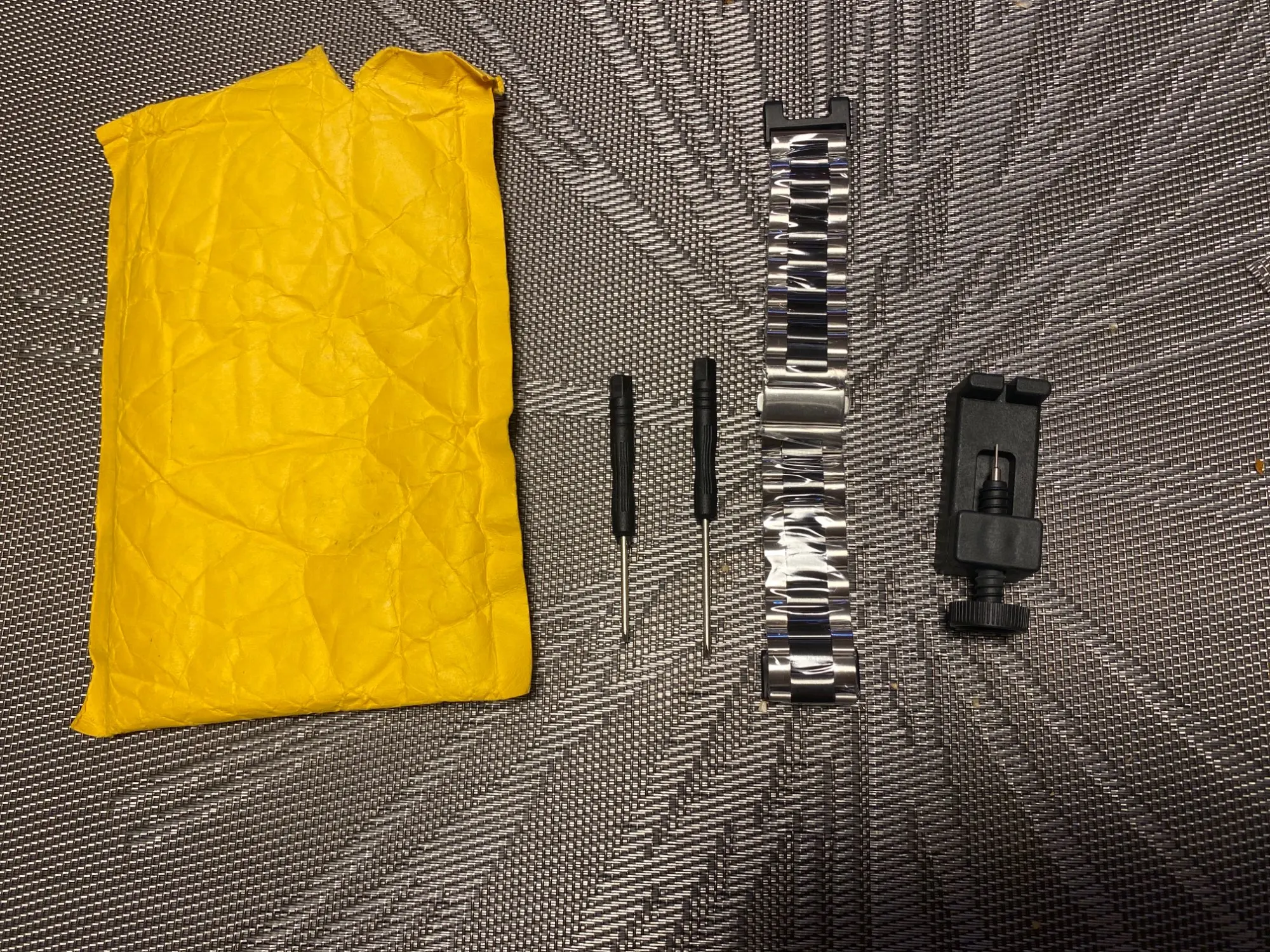дошло быстро. около двух недель. в комплекте две отвёртки и удалитель звеньев. отвёртки ужасного качества. так и не смог ими снять ремешок. пришлось воспользоваться обычной.