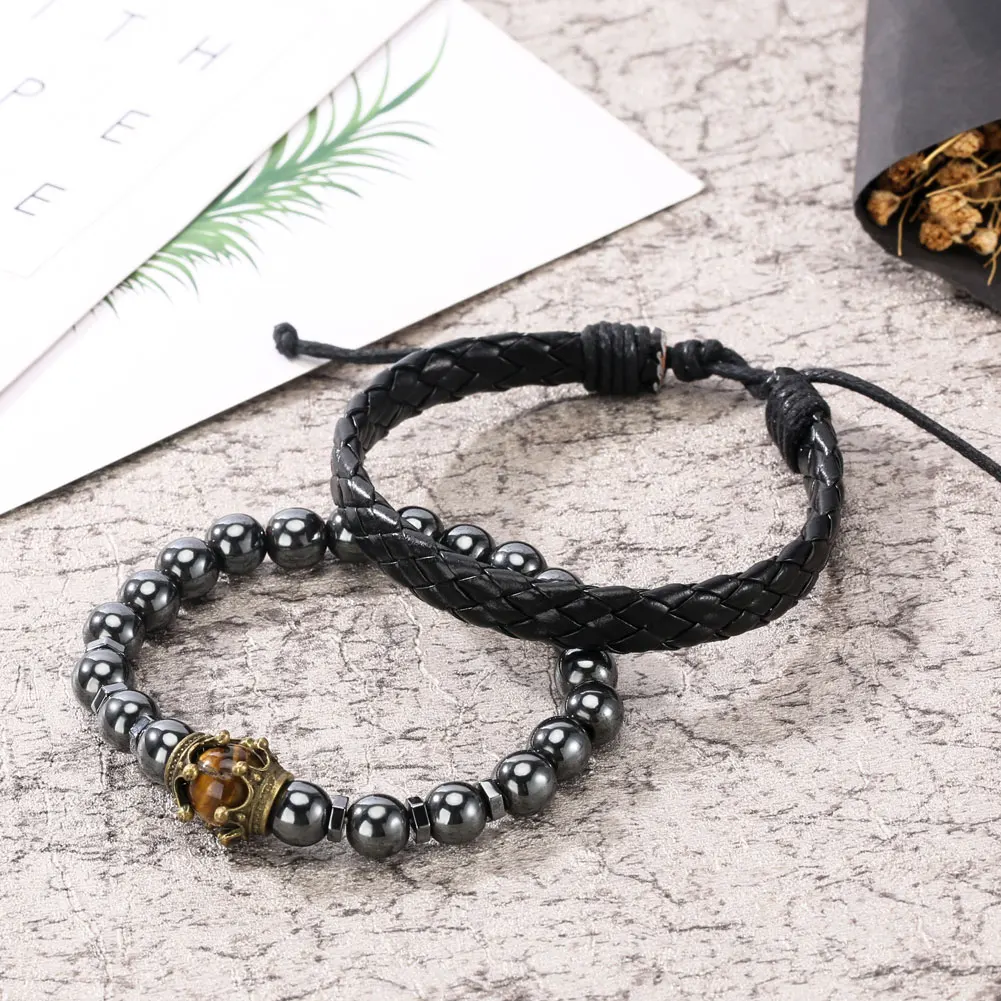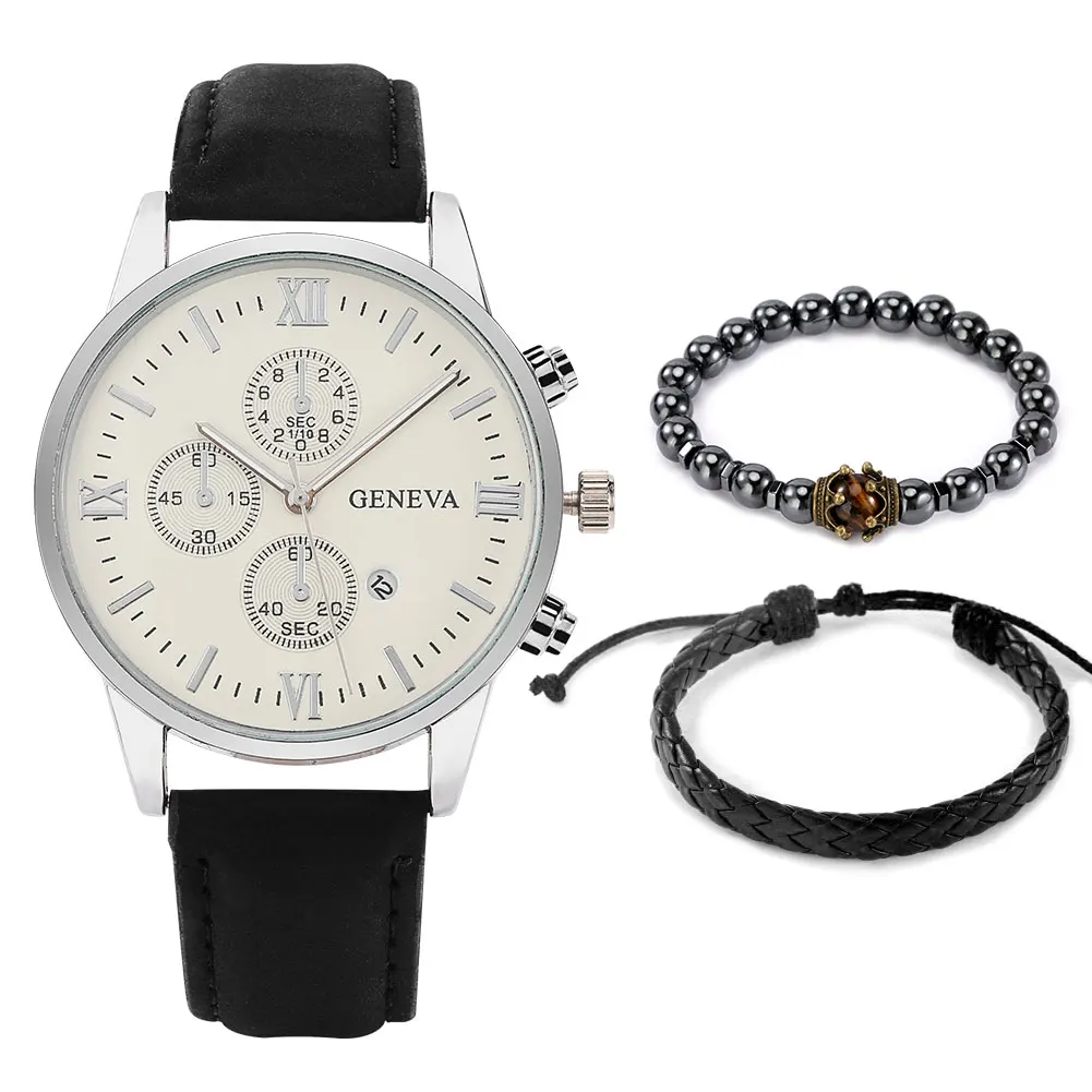 Набор модных мужских часов и браслетов, белый кварцевый Циферблат с римскими цифрами, кожаный ремешок, эластичный регулируемый плетеный браслет, подарочная коробка