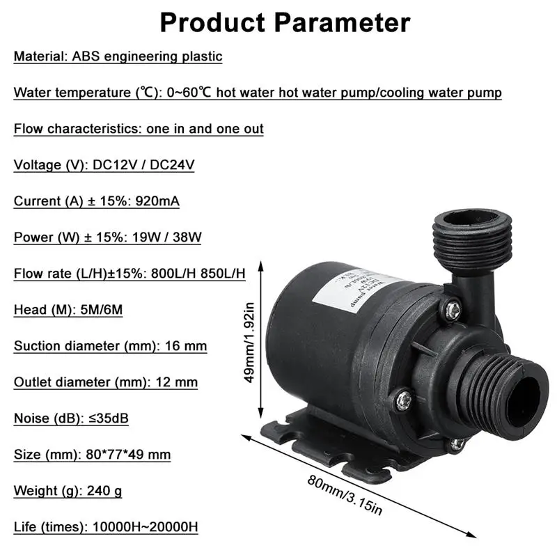 Характеристики: Бесщеточный насос, не может работать без воды, высокое качество, длительный срок службы, малый размер, высокая устойчивость к давлению, тихий, высокая скорость потока, легкая установка, конкурентоспособная цена.
