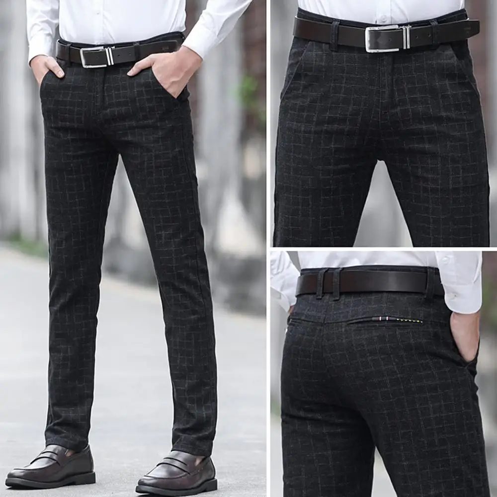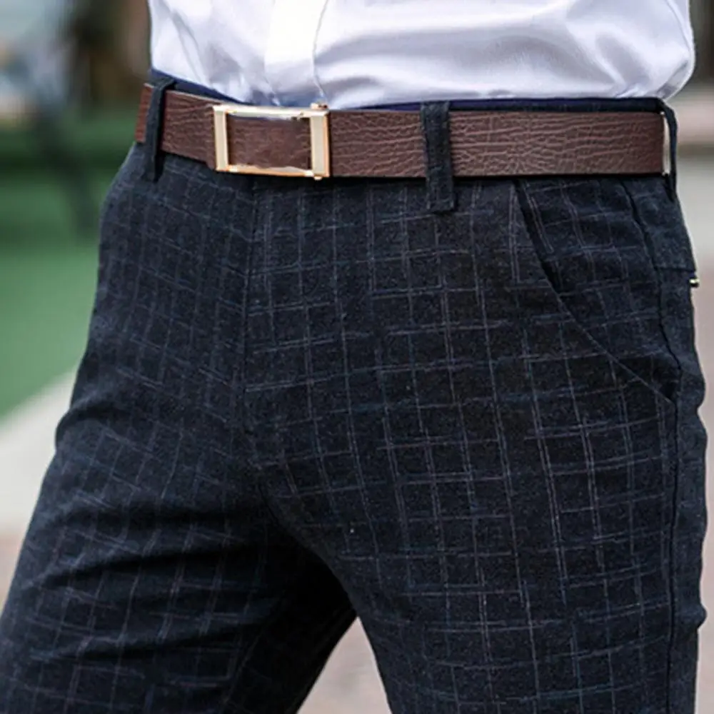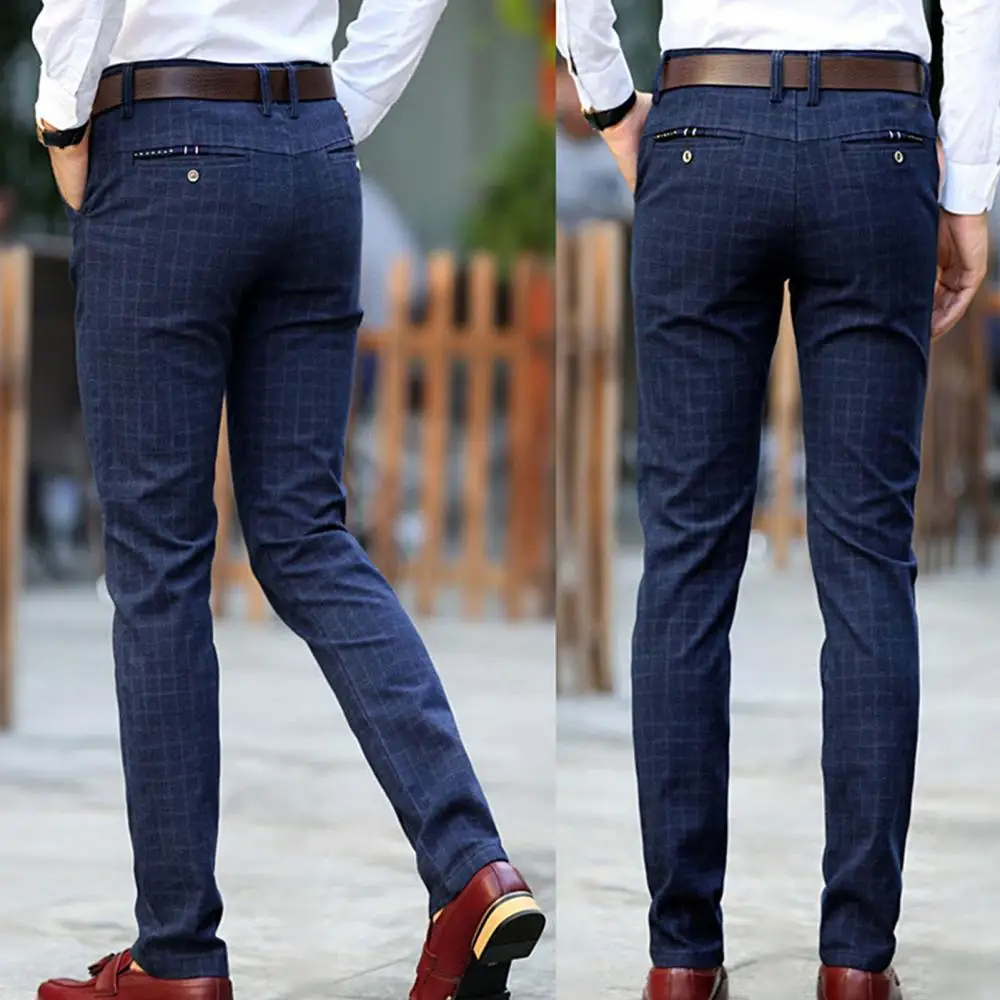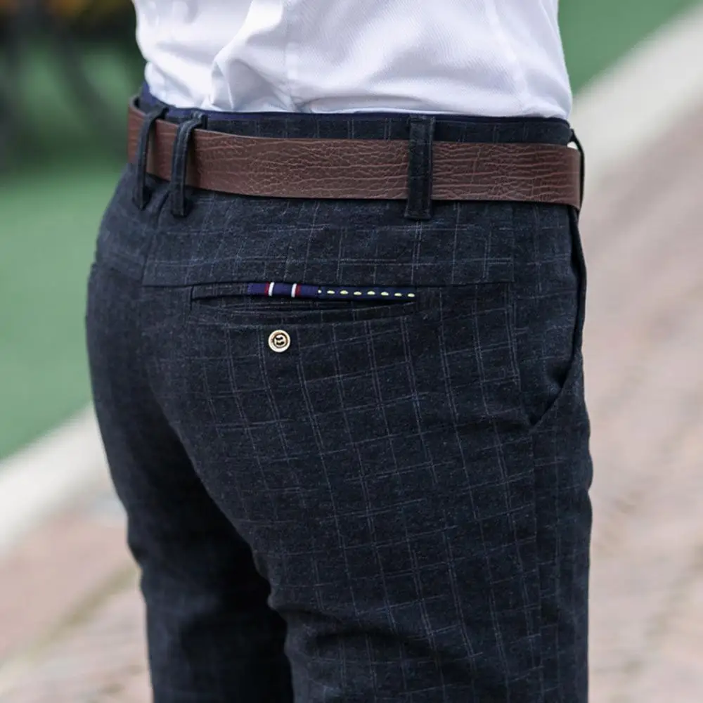 Прямая поставка, Мужские осенне-зимние клетчатые длинные облегающие брюки с карманами, офисные классические брюки