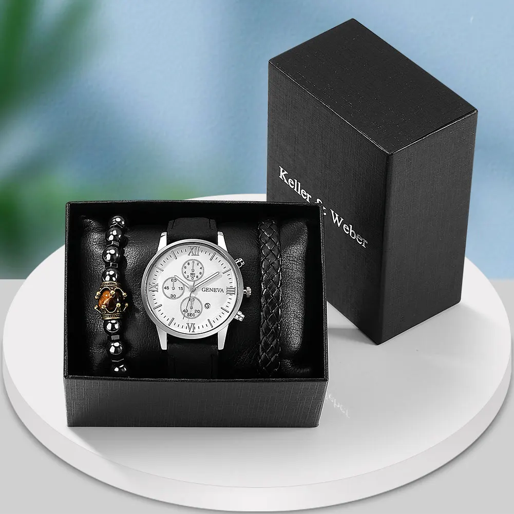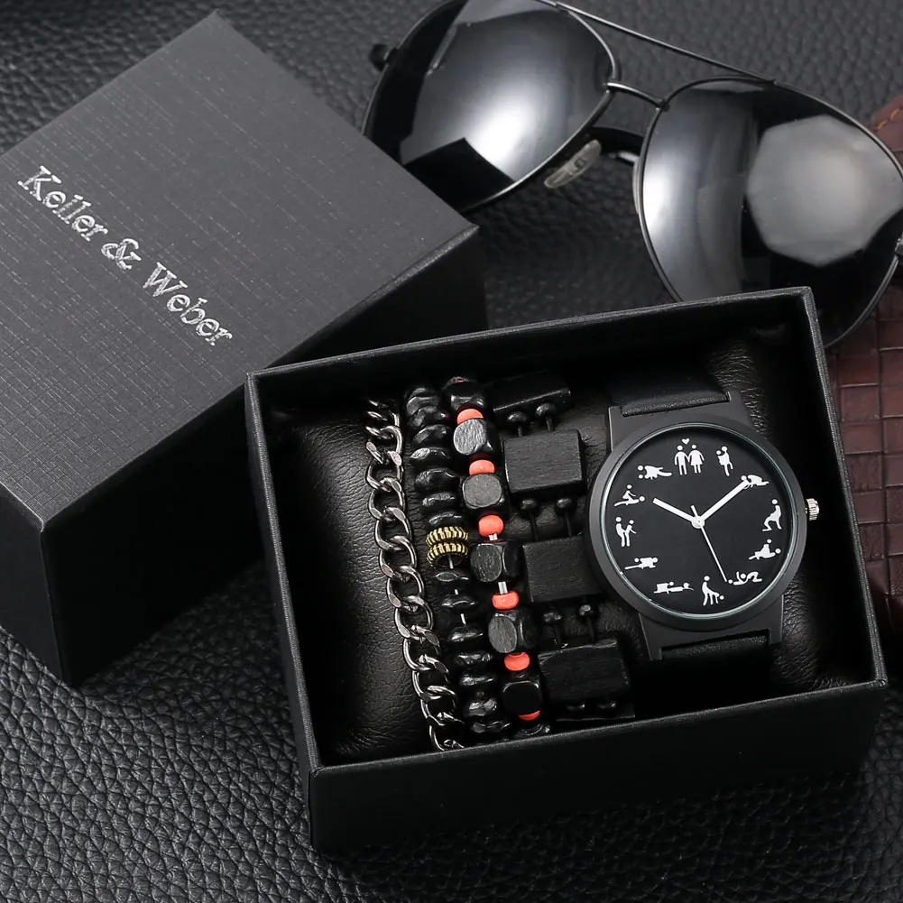 Мужские часы, браслет, набор, мужские черные кварцевые часы для мужчин, кожаный ремешок, пряжка, коричневый браслет, лучший подарок для мужчин
