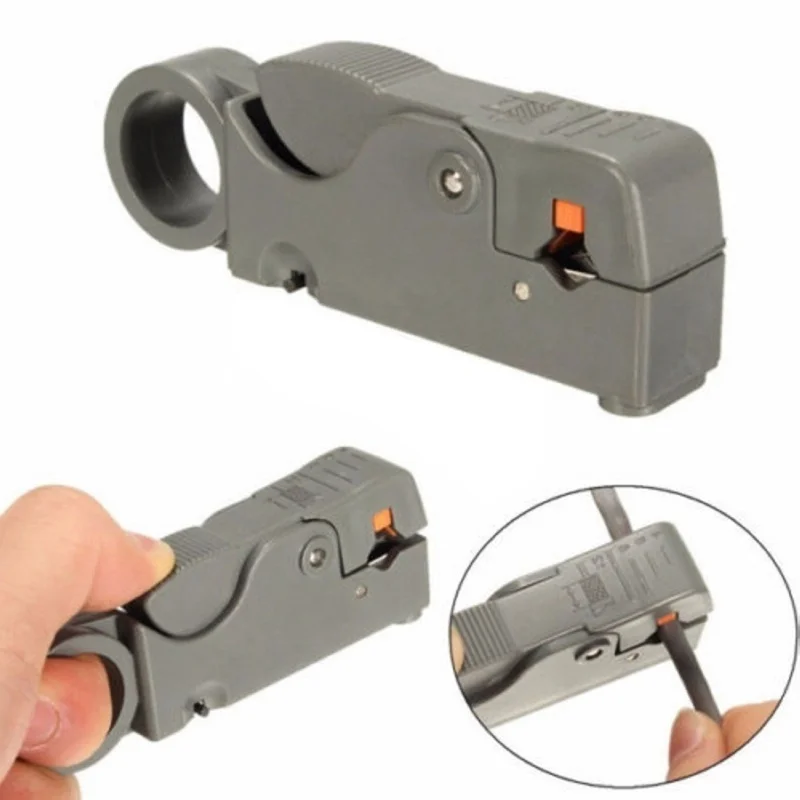 Особенности: 1. Наружные полосы коаксиальных кабелей, подходит для RG-58/6/7/11Кабели. 2. С тремя лезвиями. 3. Полностью регулируемые и сменные лезвия. 4. Простота в эксплуатации: зафиксируйте инструмент над кабелем, поверните по часовой стрелке, затем вытяните нежелательную часть. 5. Изготовлен из ударопрочного материала. 6. Не требует батареек или электричества. 7. Эргономичный дизайн, прост в эксплуатации.