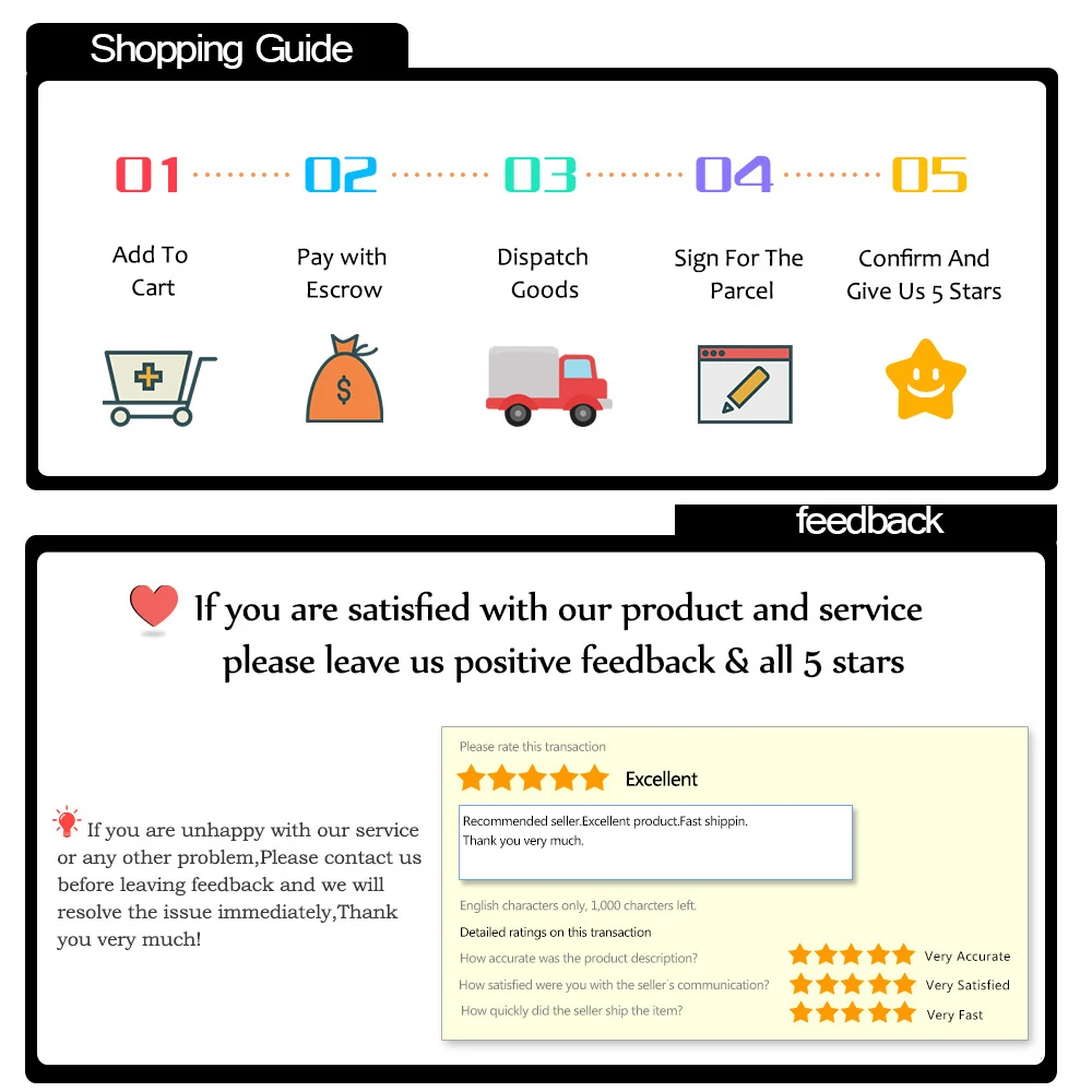 1. Если вы удовлетворены нашей продукцией, Мы будем признательны за ваши отзывы с пятью звездами. Мы дадим вам те же пять звезд отзывы. Но если у вас есть какие-либо проблемы с полученным товаром, мы хотели бы, чтобы вы связались с нами, прежде чем оставить отзывы. Мы предоставим вам отличные решения. 2. Мы поддерживаем высокие стандарты отличного качества и стремимся достичь 100% удовлетворенности клиентов! Если у вас есть какие-либо вопросы, пожалуйста, сначала свяжитесь с нами! Прежде чем мы попросим вас дать нам нейтральные или негативные отзывы, пожалуйста, свяжитесь с нами. Мы можем предоставить вам отличные решения, чтобы улучшить ваше удовлетворение. Пожалуйста, доверьтесь нам, чтобы решить эту проблему удовлетворительным образом. 3. Если у вас есть какие-либо вопросы, пожалуйста, свяжитесь с нами. Наслаждайтесь покупками.
