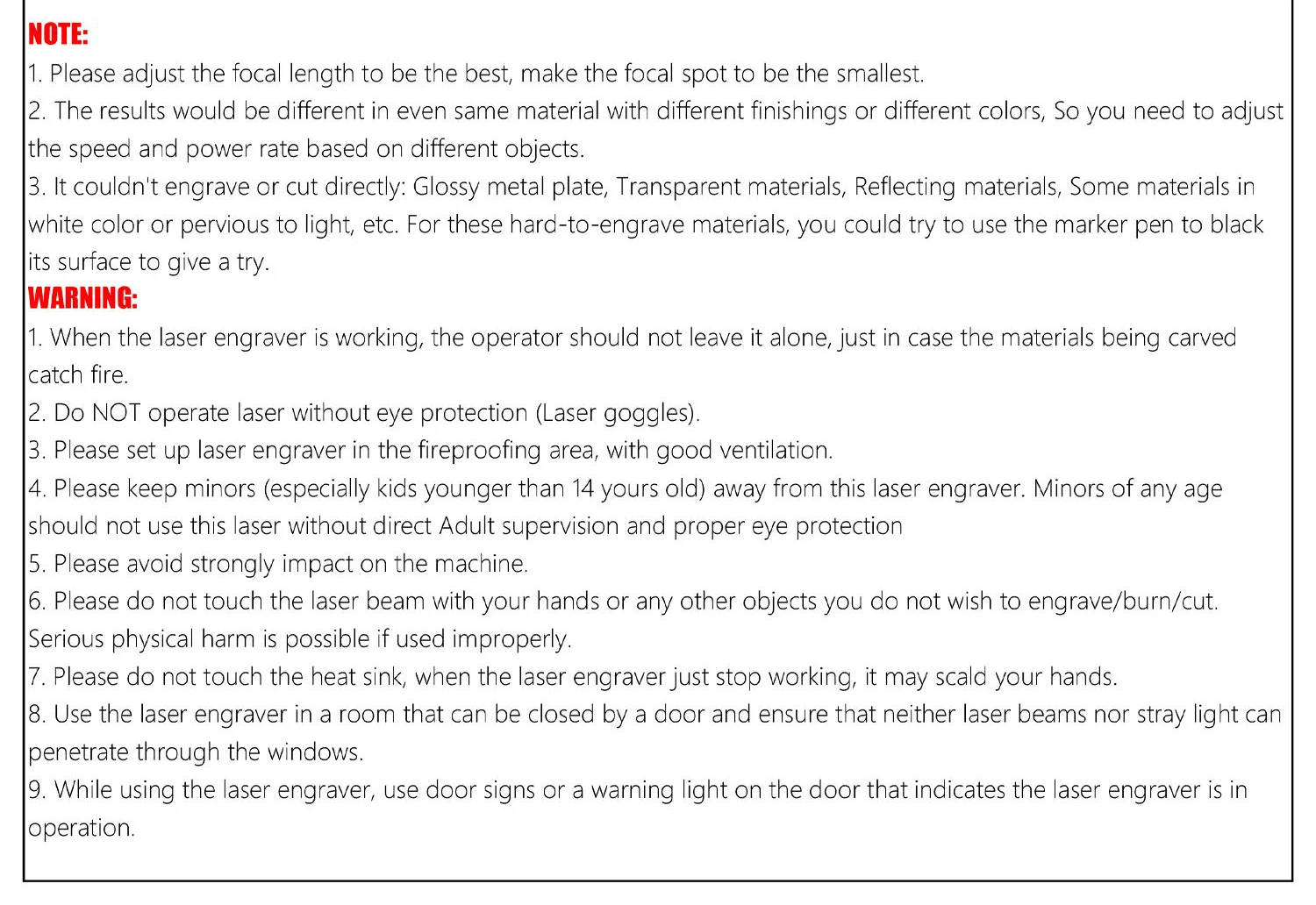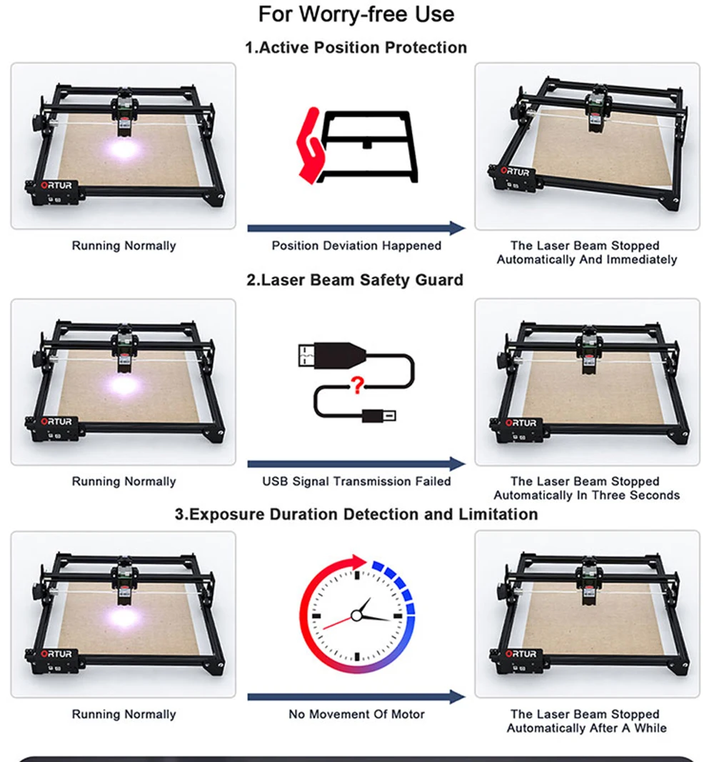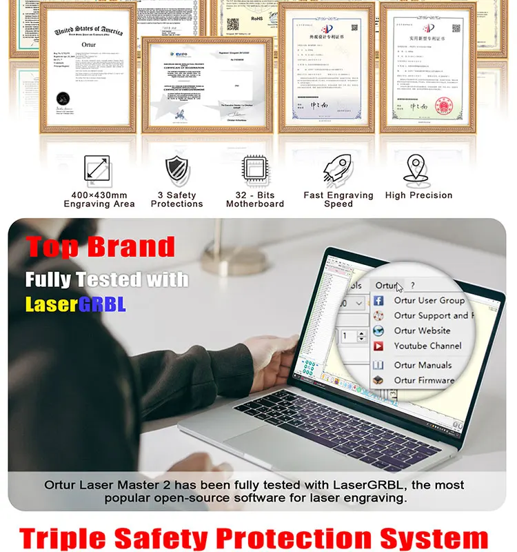 ORTUR Laser Master 2 описанияКраткое описание:● Лазерный мастер 2 - 7 Вт хорошо подходит для гравировки изображений.● Лазерный мастер 2 - 15 Вт является наиболее экономически эффективным, доступен как для гравировки, так и для резки.● Лазерный мастер 2 - 20 Вт обладает более высокой мощностью и поддерживает более быструю гравировку и резку.Основные характеристики:●Специализированная материнская плата с MCU STM32Он может обрабатывать 32 инструкции, поддерживать скорость передачи данных до 921600, более мощный!●Самые передовые 32 бит лазерный гравер прошивкаOrtur laser master прошивка, умнее, быстрее, более высокая точность и проще в использовании.● Диапазон мощности лазера может быть S0 - S1000, по сравнению с 8 битами настольных лазерных гравировальных станков, которые имеют только S0 - S255, Ortur лазерный мастер может контролировать лазерный луч более точно, может даже использовать лазерное устройство высокой мощности, чтобы «нарисовать» изображение на бумаге, О том, что 8 бит высокой мощности лазерные гравировальные инструменты не смог нажать на кнопку.● Скорость гравировки может достигать 3000 мм/мин. (Если не считать результат лазерной резьбы, скорость движения может достигать 1000 мм/сек.)●Защита активного положенияНа материнской плате есть g-сенсор, если машина обнаруживает неавторизованное движение, лазерный луч остановится.●Защита лазерного лучаЕсли ваша компьютерная система остановлена или USB кабель отключен, привело к тому, что лазерный гравер останавливает движение, лазерный луч остановится, чтобы предотвратить пожар.●Обнаружение и ограничение длительности экспозицииЕсли лазерный гравер находится под контролем, но пользователи забывают работать и поддерживать работу лазерного луча, дополнительная безопасность отключится, чехол остановит движение двигателя, чтобы предотвратить пожар.● LaserGRBL (бесплатное программное обеспечение) поддерживает Windows XP, 7, 8, 10. LaserGRBL является самым популярным программным обеспечением для резьбы в мире, может импортировать различные форматы изображений, вы можете редактировать в PhotoShop, Inkscape, CAD и т. Д., а затем подключаться к граверу с помощью лазерного LaserGRBL для гравировки и резки.● LightBurn (Платное программное обеспечение, lightburnsoftware.com) поддерживает Windows, Mac OS и Linux. Это самое популярное Платное программное обеспечение для резьбы в мире, очень простое в использовании.● Этот лазерный гравер поддерживает режим PWM.● Предварительно собранные детали, просто нужно 10 - 20 минут для установки машины.● Большая площадь гравировки 400x430 мм.● Рама из алюминиевого профиля + структурный кабель, прочная структура, плавная работа, привлекательный внешний вид● Синхронизация механической структуры вала, избегайте синхронизации на двух y-рельсах во время полноскоростной гравировки.Спецификация:● Материнская плата: 32 бит материнская плата с STM32 MCU● Прошивка: Ortur Laser Master прошивка● ОС верхнего компьютера: Windows (работает с LaserGRBL ), MAC OS и Linux (работает с LightBurn)● Мощность лазерного гравера: 36 Вт, 12 В 3 А● Электрическая мощность лазерного модуля: 7 Вт, 15 Вт, 20 Вт● Длина волны: 445 ± 5 нм● Переменный фокус: Да● Фокусное расстояние по умолчанию: 55 мм для лазерного модуля 15 Вт и 20 Вт; 58 мм для лазерного модуля 7 Вт● Формат ввода: NC, BMP, JPG, PNG, DXF и т. Д.● Площадь резьбы: X: 400 мм x Y: 430 мм● Скорость резьбы: 3000 мм/мин и меньше● Размер изображения: нет ограничений (точ