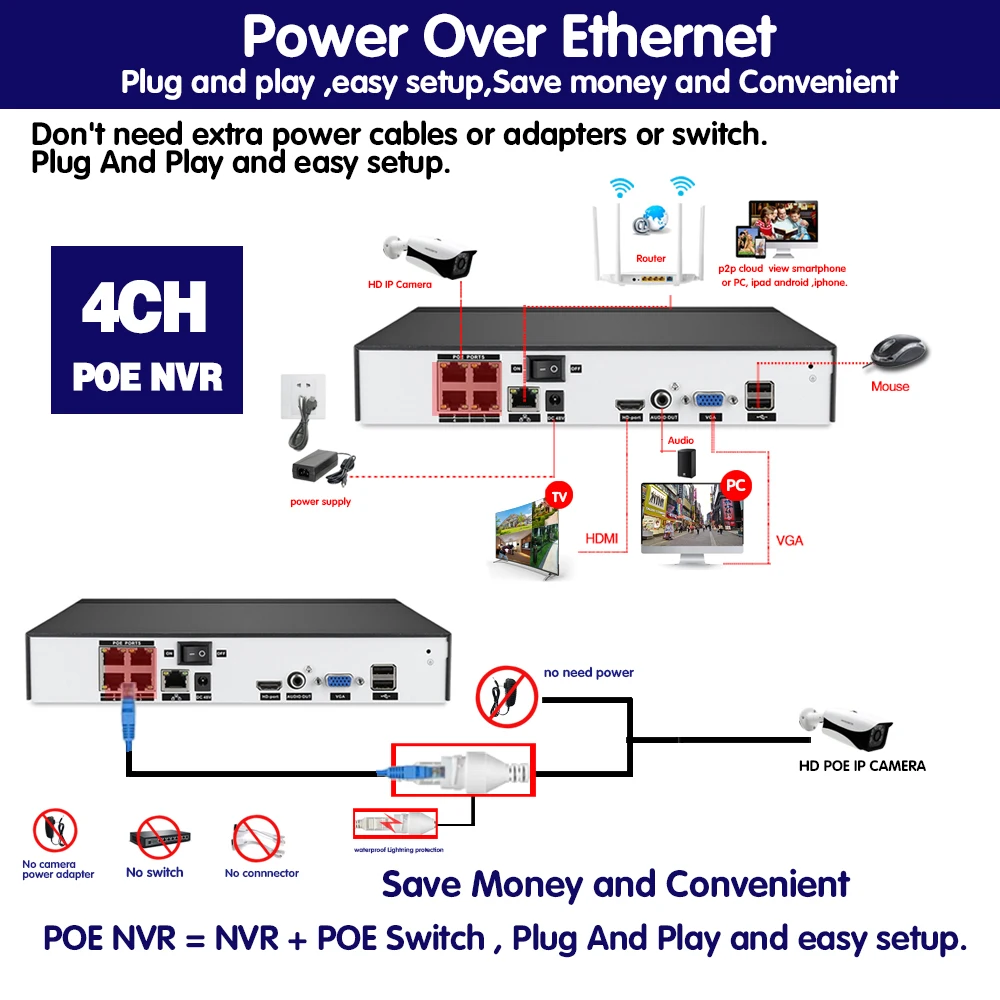Нет дополнительных кабелей питания или адаптеров, просто подключив ip-камеру к NVR с помощью одного кабеля, вы можете легко завершить установку без знания о компьютере или сети и начать наслаждаться супер простым мониторингом среди вашего смартфона, планшета или ПК.