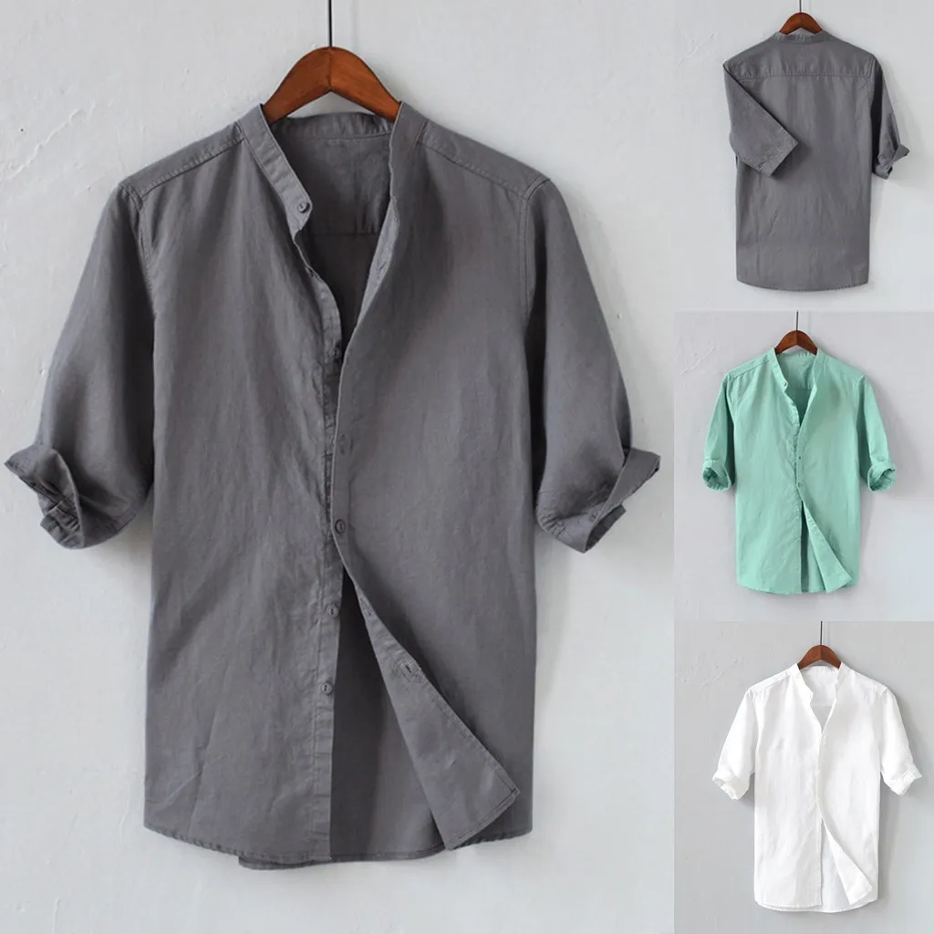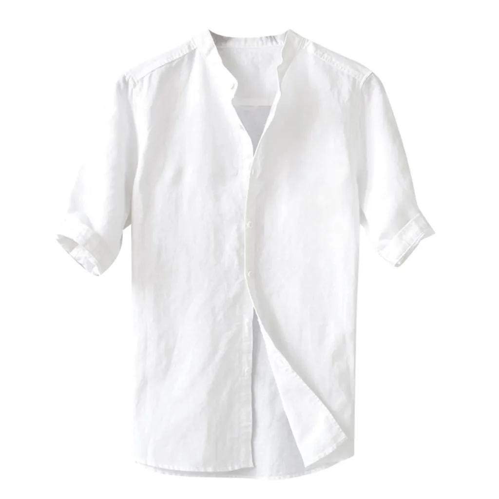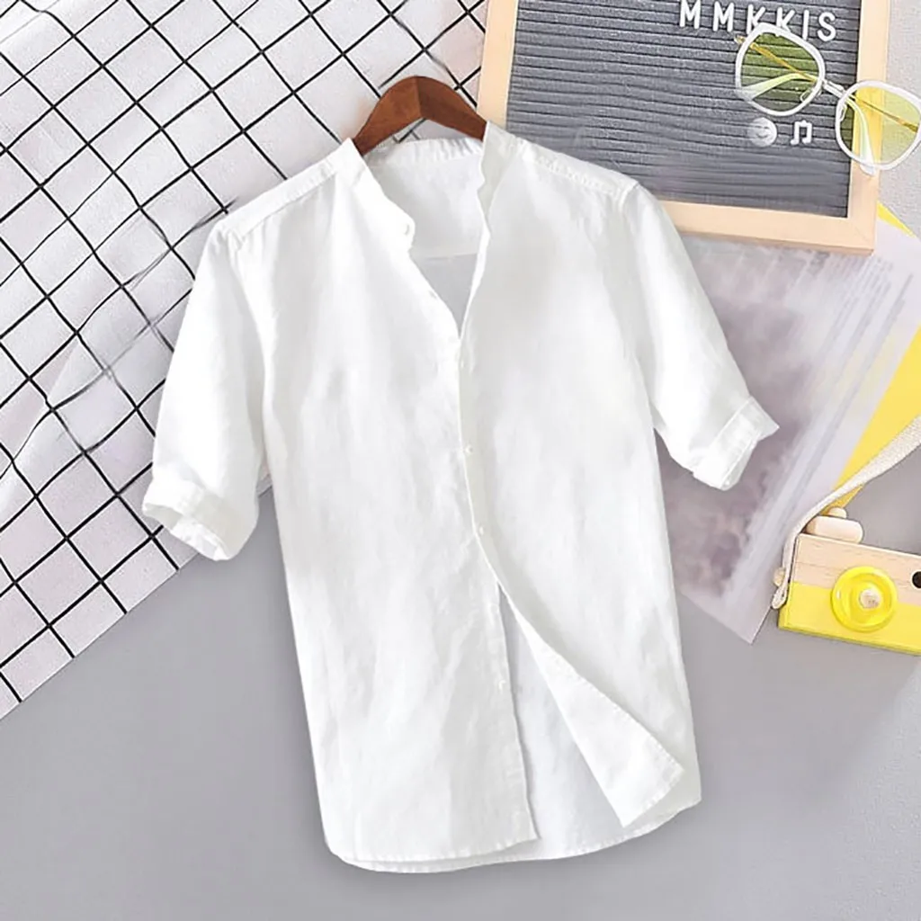 Рубашка мужская с рукавами-пятью, дышащая хлопковая сорочка, однотонная, на пуговицах, белая, лето