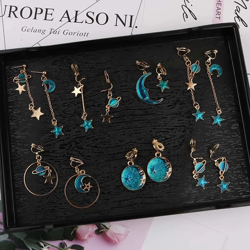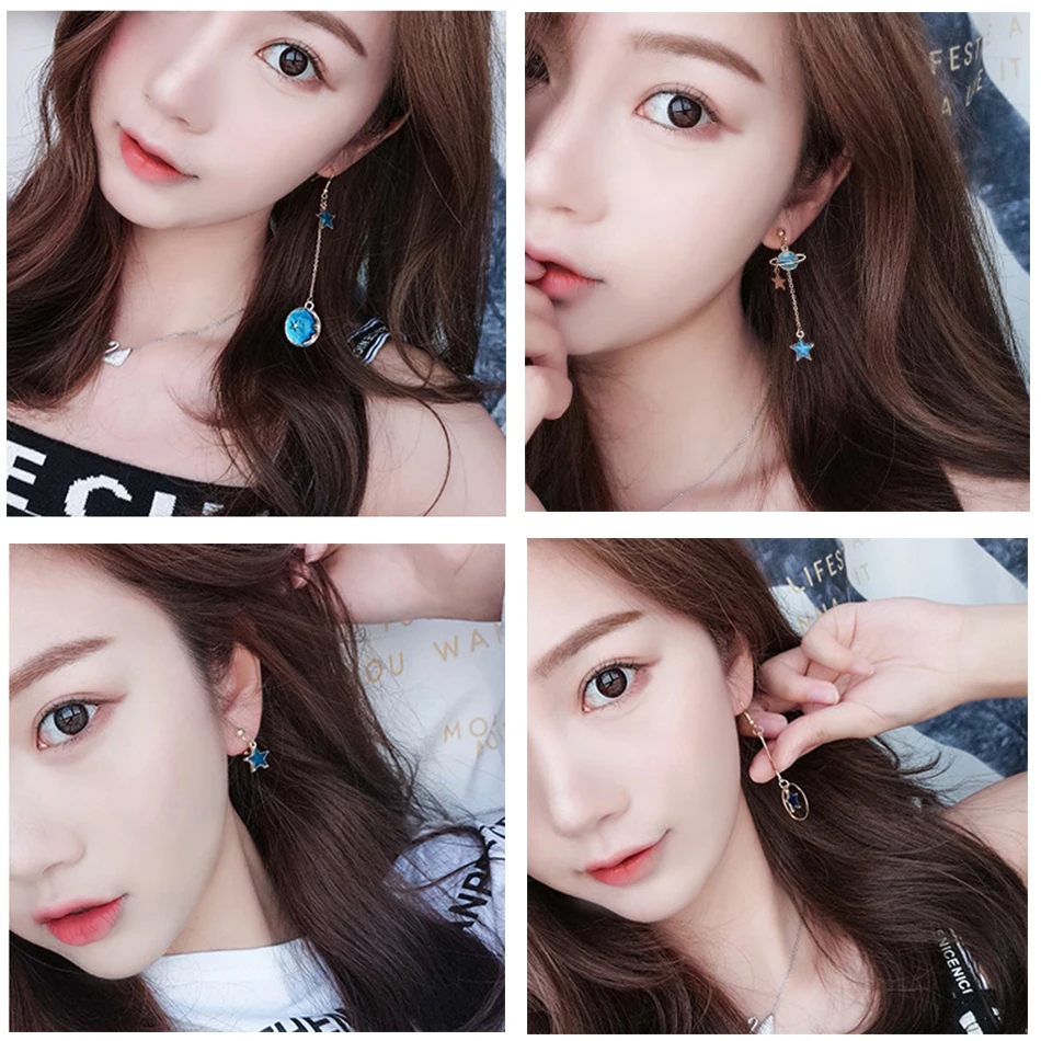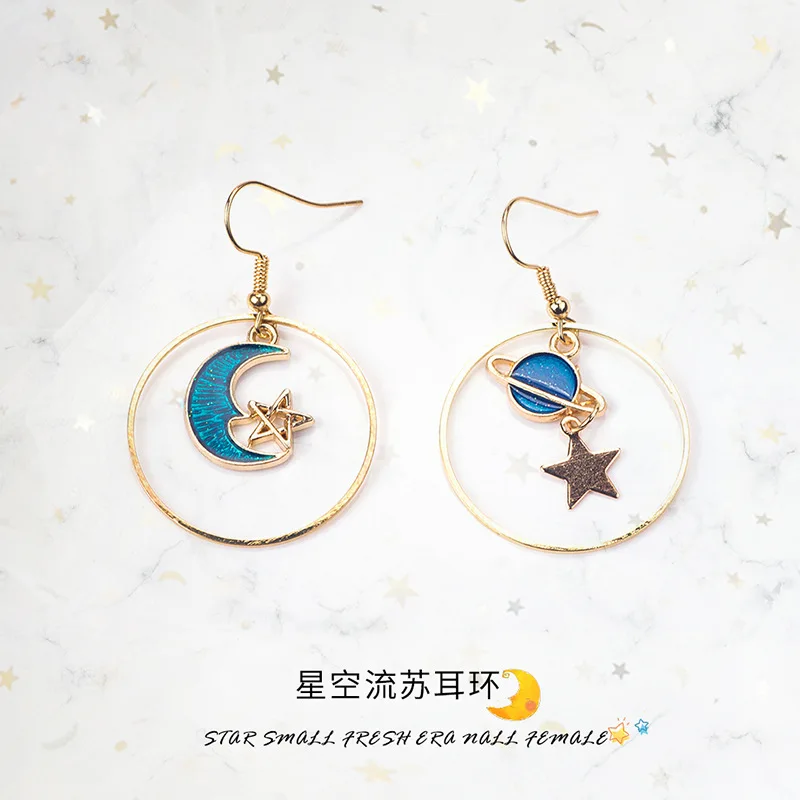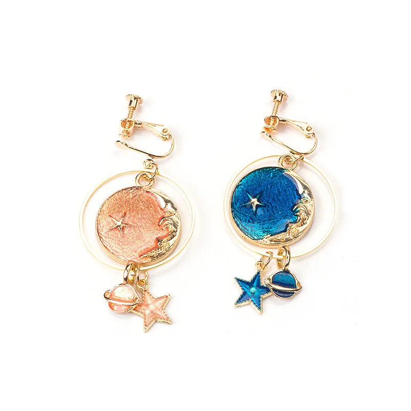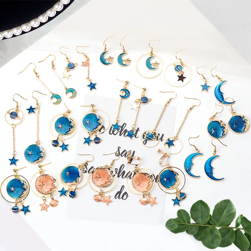 Синие розовые серьги-клипсы в форме звезды луны планеты круглые серьги в Корейском стиле Новые эмалевые длинные серьги не проколотые для девушек женщин подарок для вечеринки