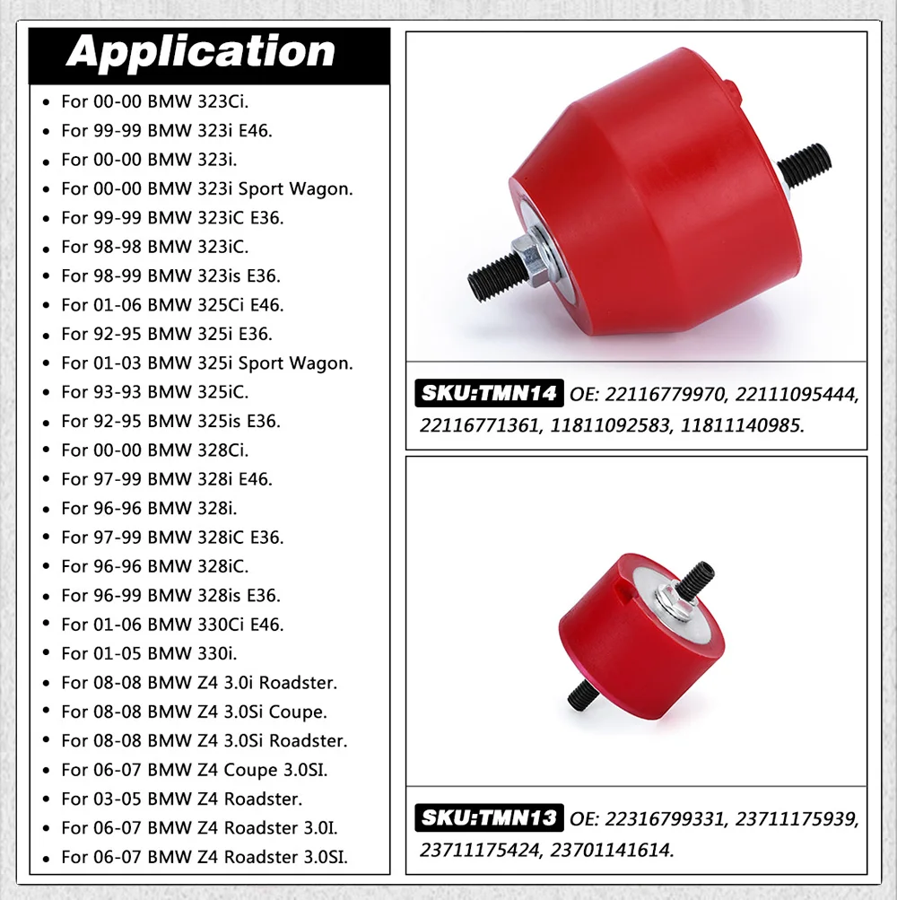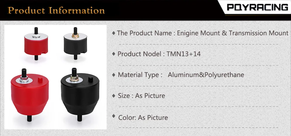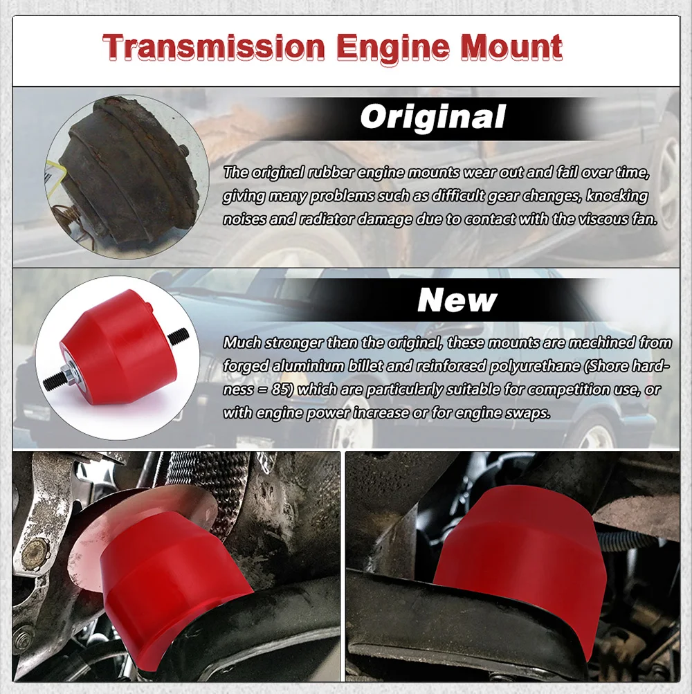 100% гарантия качества протестирована, более отзывчива, дешевле, проще в установке.Надеюсь, у вас никогда не будет удара или жесткости, так как это почти всегда приводит к сломанным креплениям двигателя, трещинам креплению на уши или хуже.Идеально подходит для занятий спортом! (цепь, дрифт...)Установка непосредственно на месте оригинальных деталей.Намного прочнее и жестче, чем OEM.Может быть uesd в E30 S50 или M50.Материал и цвет: