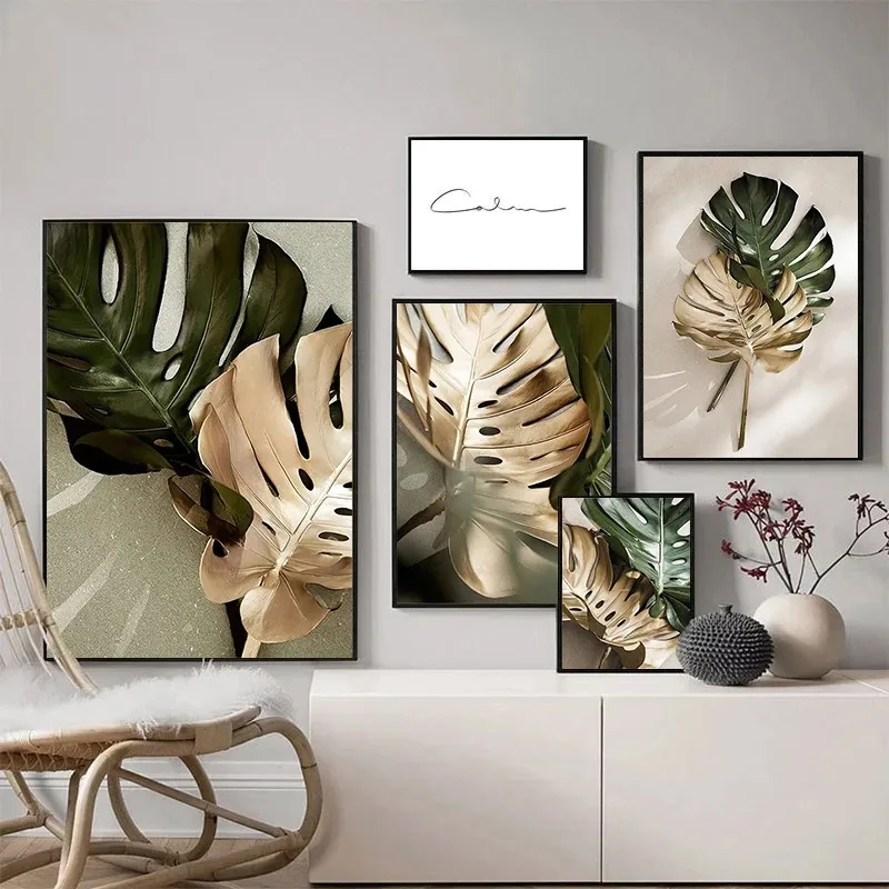 Золотистая и зеленая Картина на холсте с пальмовыми листьями, ботаническая Скандинавская Настенная картина с растениями, плакаты и принты, картина, декор для комнаты