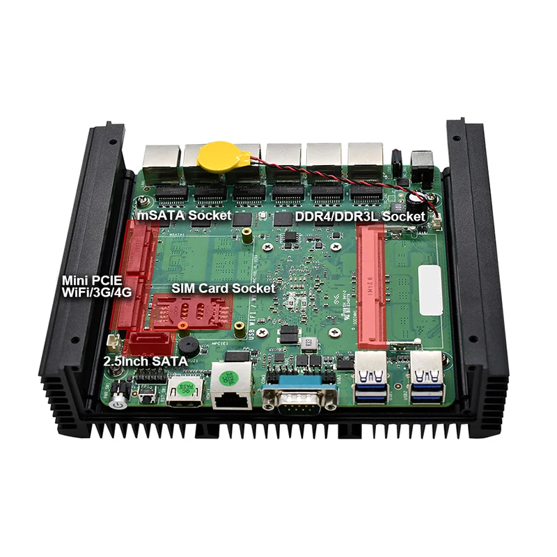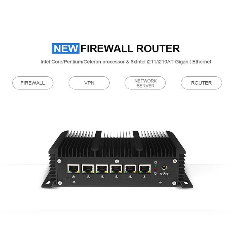 -6 гигабитных локальных сетей RJ45 Intel i211/i201-AT и 2 COM-порта RS232, поддерживают ОС Windows, Linux и pfSense.