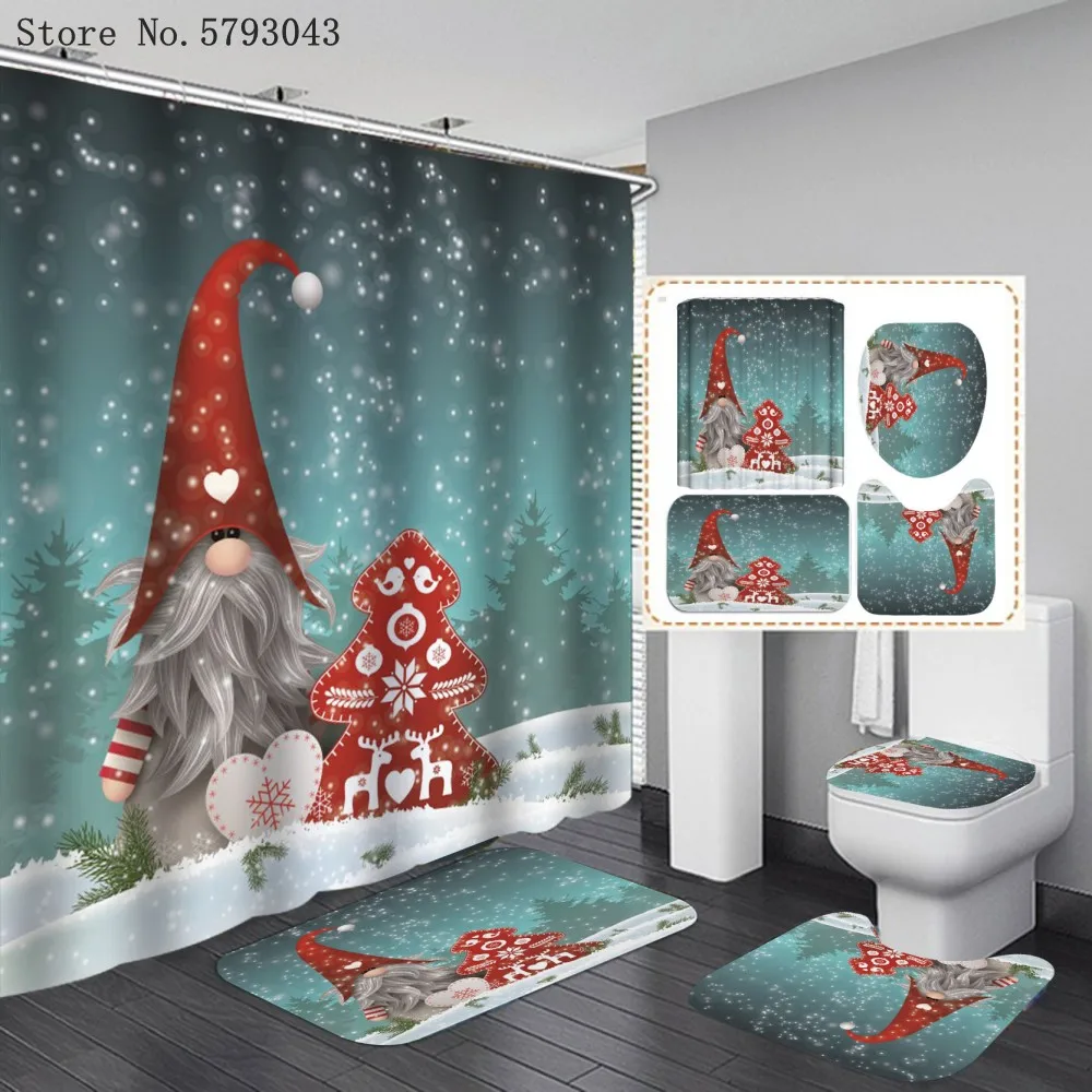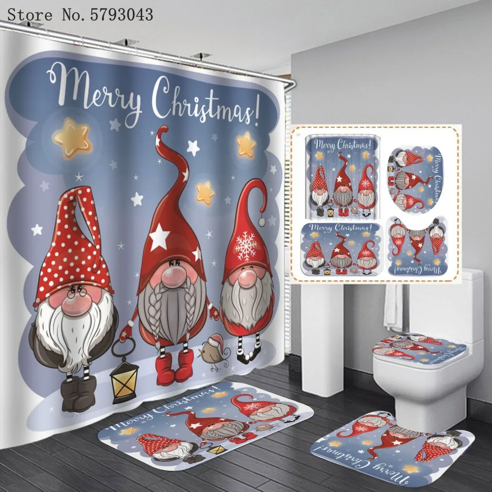 Рождественская занавеска для душа, 4 предмета, новогодний ковер, крышка для туалета, коврик для ванной, Набор накладок, праздничный декор для занавески для ванной комнаты