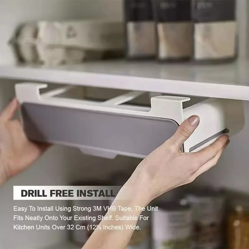 Легко установить с помощью прочной ленты 3M VHB, устройство аккуратно помещается на существующую полку. Подходит для кухонных блоков шириной более 32 см (12 ⅝ дюймов).