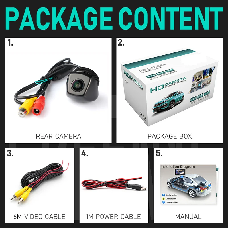 1. FS-HD камера заднего вида2. Саморезы и коробка3. Видео кабель 6 м4. Кабель питания5. Руководство пользователя