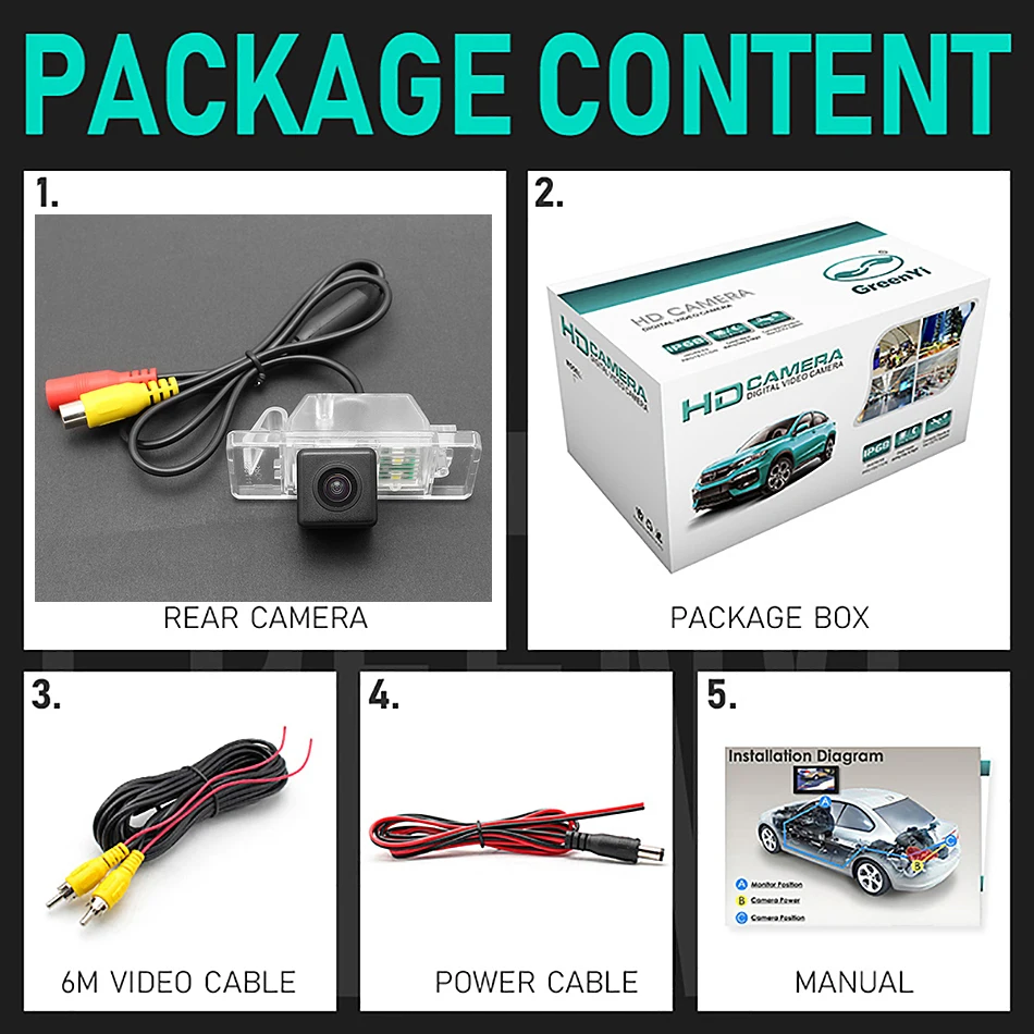 1. Камера траектории заднего вида2. Саморезы и коробка3. Видео кабель 6 м4. Кабель питания5. Руководство пользователя