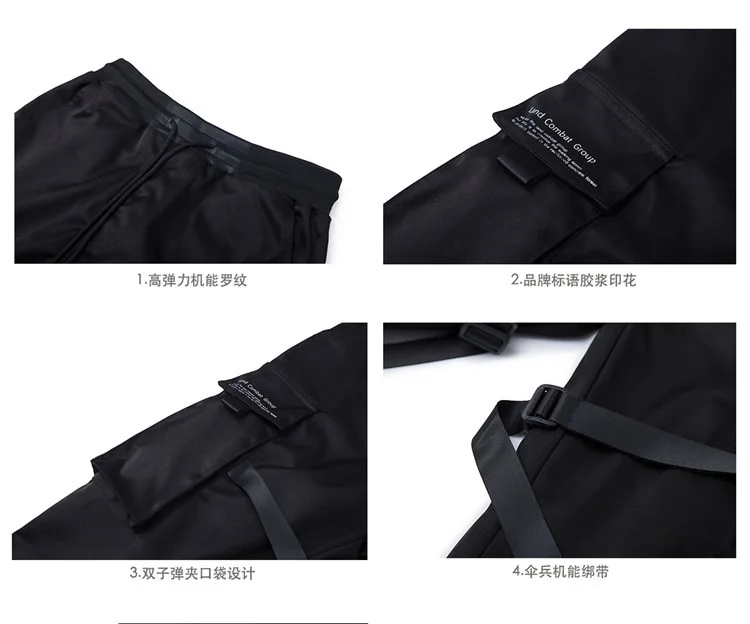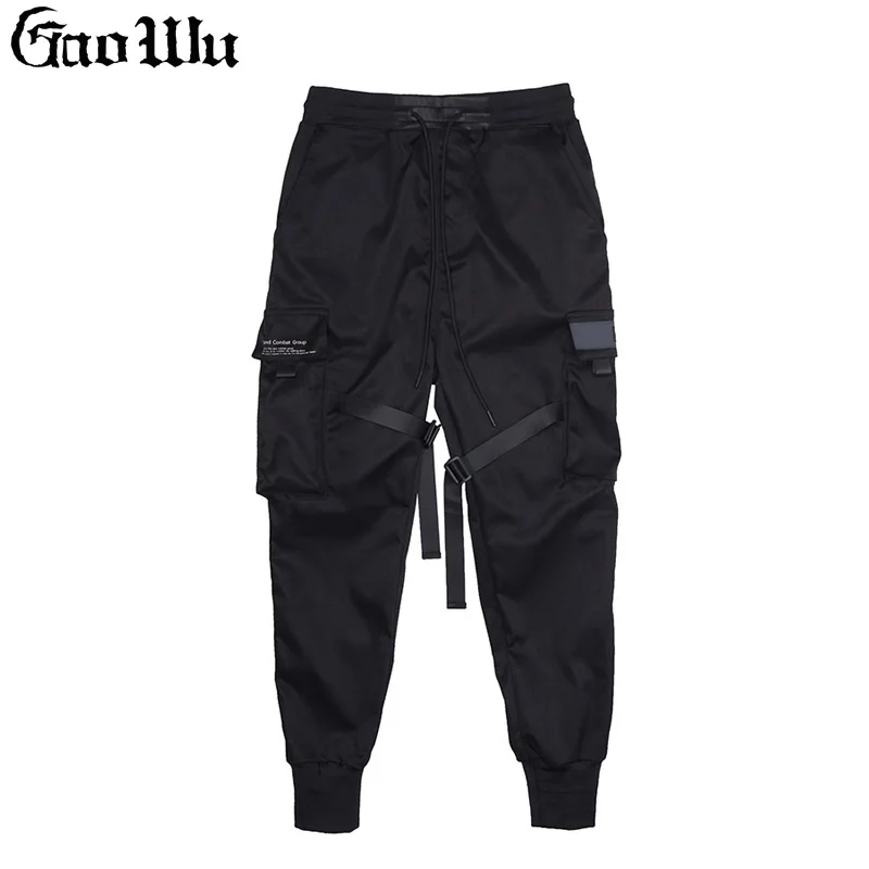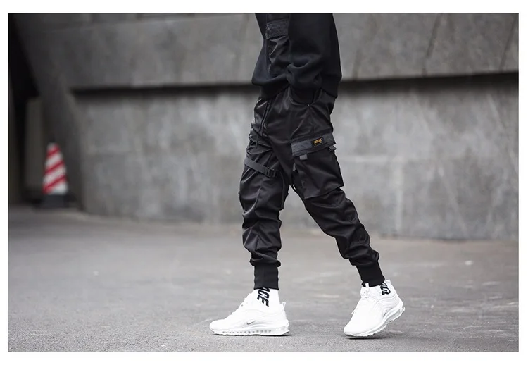 Брюки-карго мужские, черные, повседневные, с боковыми карманами, с лентами, в стиле хип-хоп, 2021