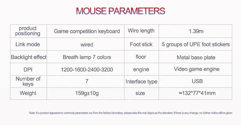 Модель: Проводная геймерская мышьДлина кабеля: 1,39 мСпособ подключения: проводнойТип интерфейса: USBКоличество клавиш: 7 клавишРазмер: 132*77*41 ммВес: 160 гЦвет мыши: черный/белыйЗадний светильник: семицветный дыхательный светильникНижняя пластина: металлическая Нижняя пластинаDPI: 1200-1600-2200-3400