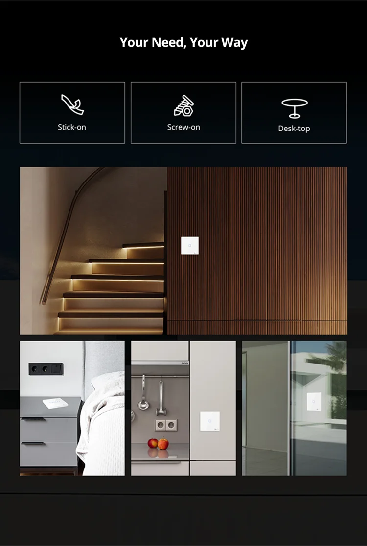 Смарт-переключатели Wi-Fi с 1-3 бандами делятся на T0 (ЕС, Великобритания и США), T1 (ЕС и Великобритания), T2 (ЕС, Великобритания и США) И T3 (ЕС, Великобритания и США). T3 доступен в черном цвете, а T0, T1 и T2 доступны в белом цвете. Дополнительно T1, T2 и T3 поддерживают пульт дистанционного управления 433 МГц.