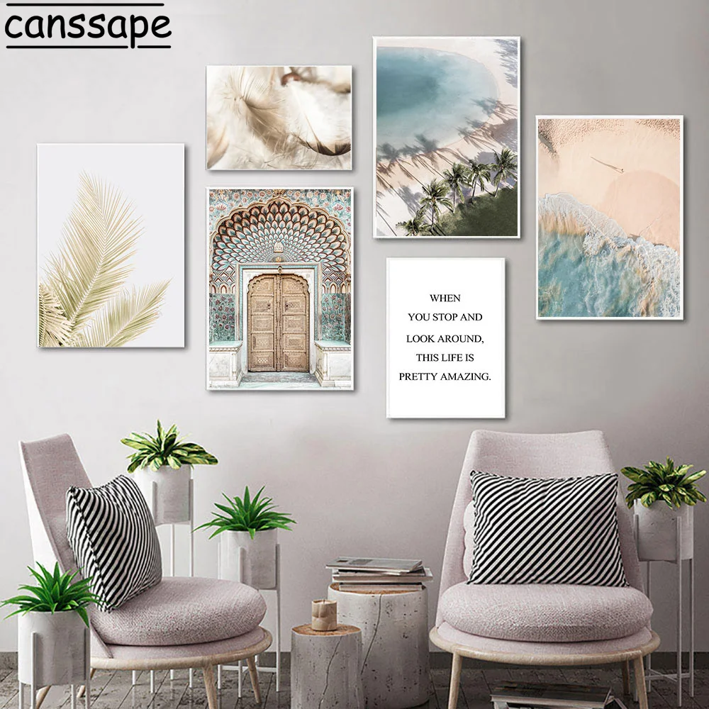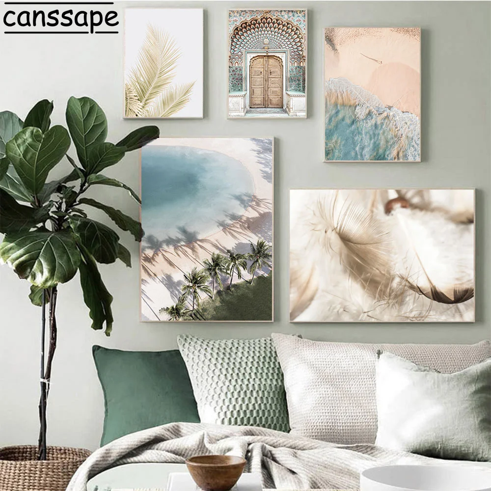 Постеры на холсте с изображением перьев, скандинавские принты, пляжные художественные постеры с пальмами, постеры с марокканскими дверями, ландшафтный эстетический Декор для комнаты