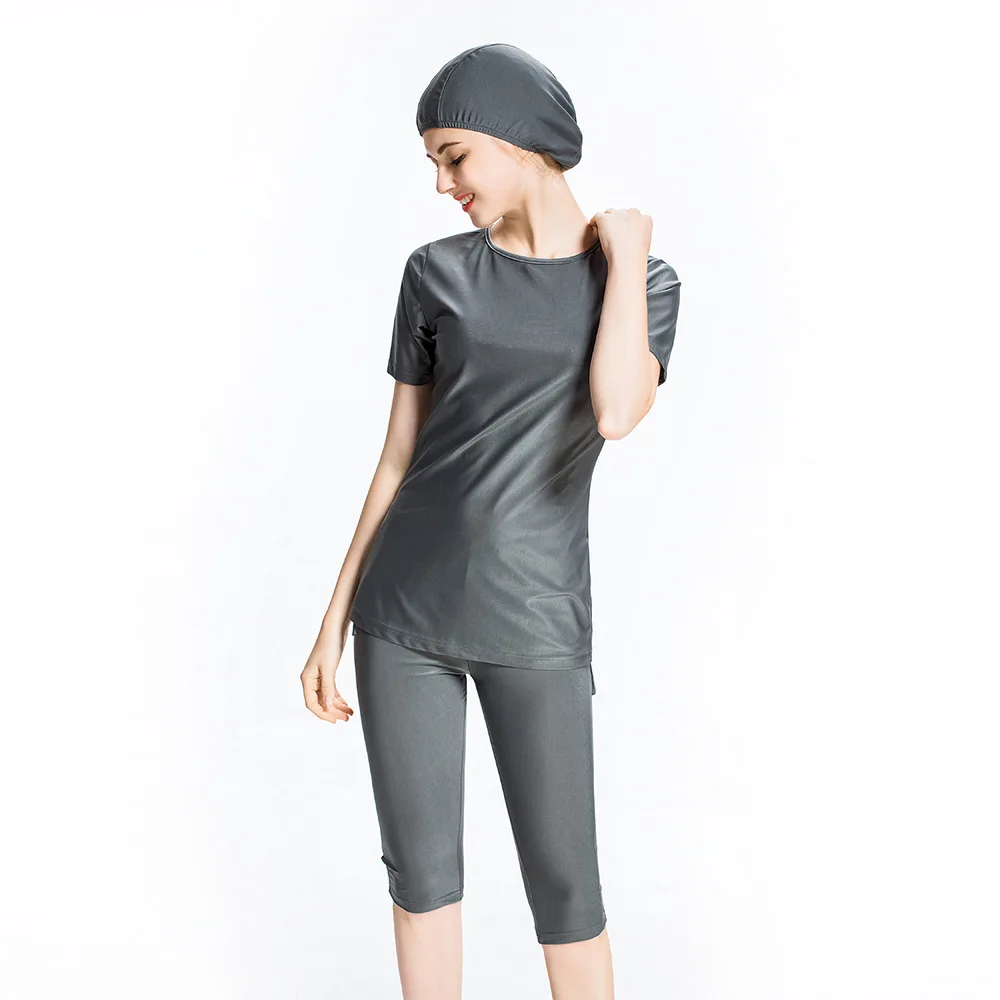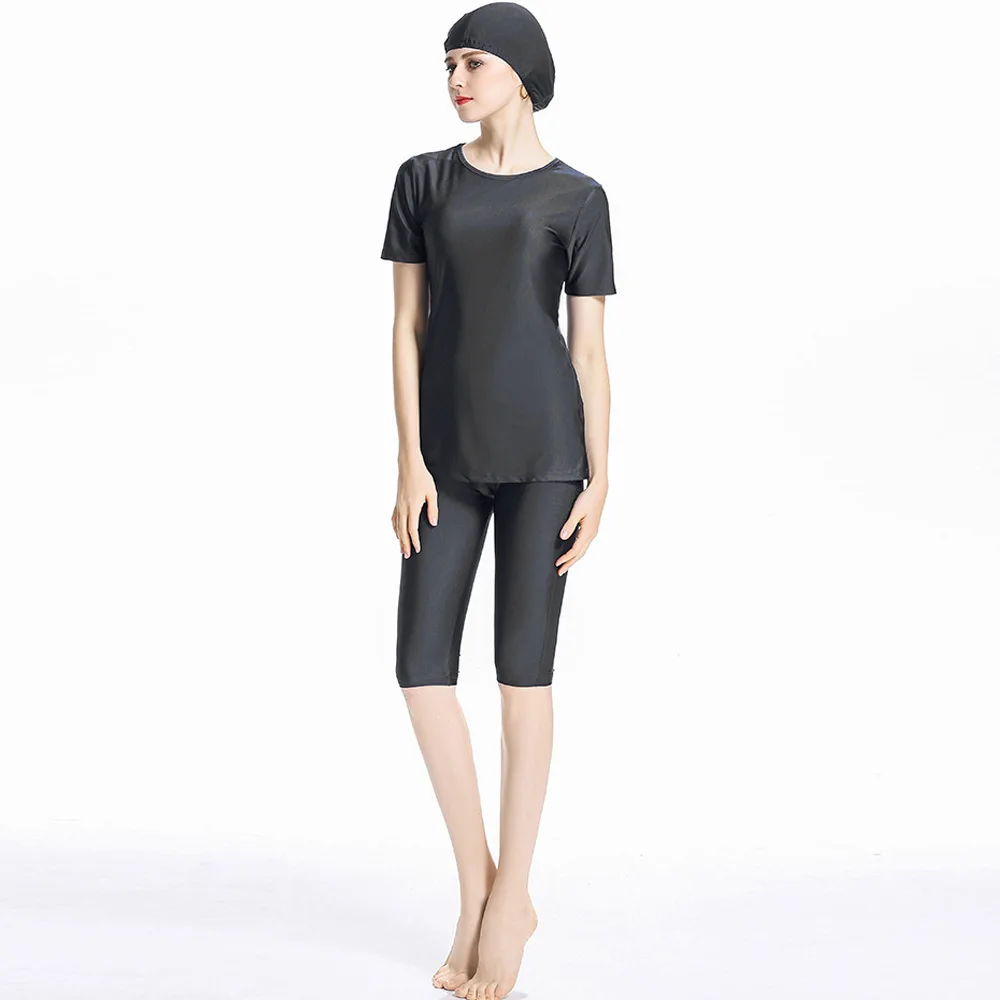 2021 Женский Цветной костюм для серфинга, скромный короткий рукав, 3 предмета, купальник, Мусульманский Исламский костюм Буркини, топ, штаны, Кепка