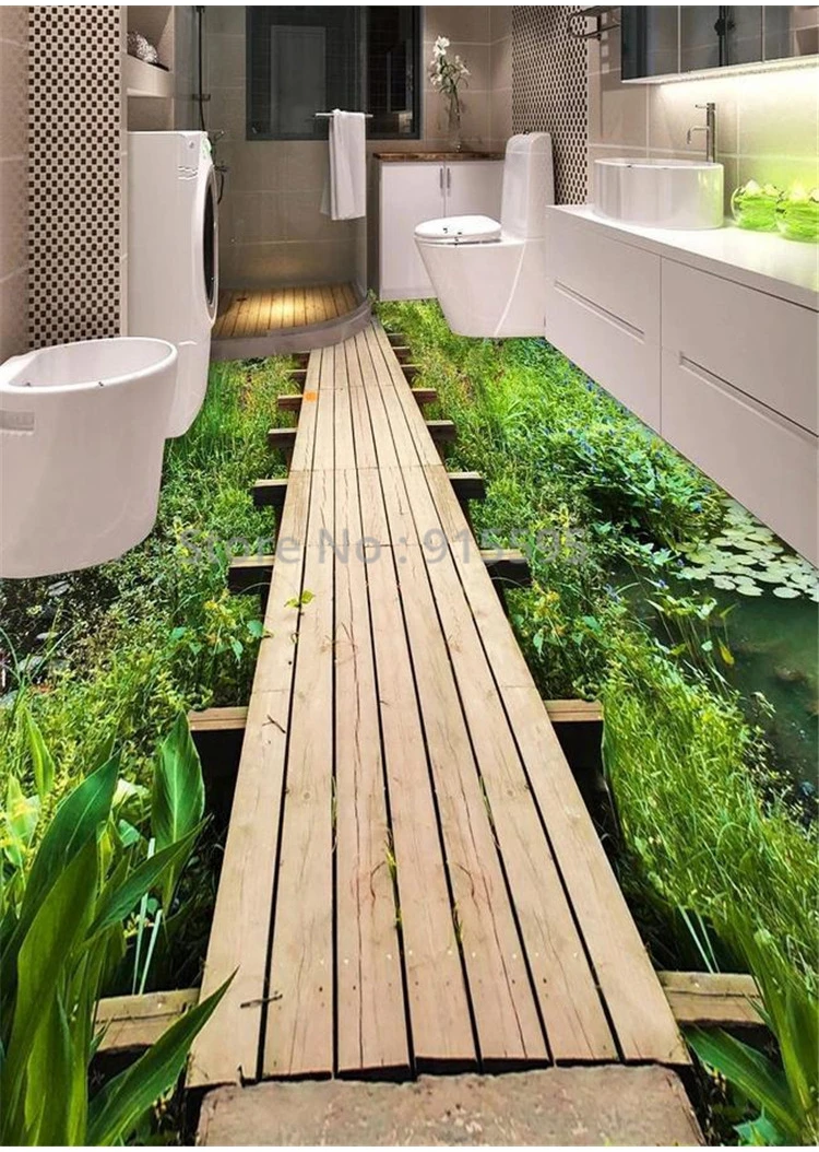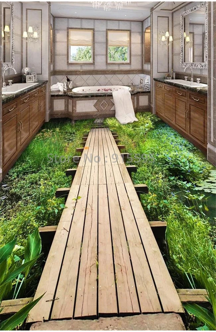 Самоклеящаяся 3d-наклейка для пола на заказ, ПВХ водонепроницаемые обои с изображением травы, пруда, утка, дощатого моста, ванной, спальни