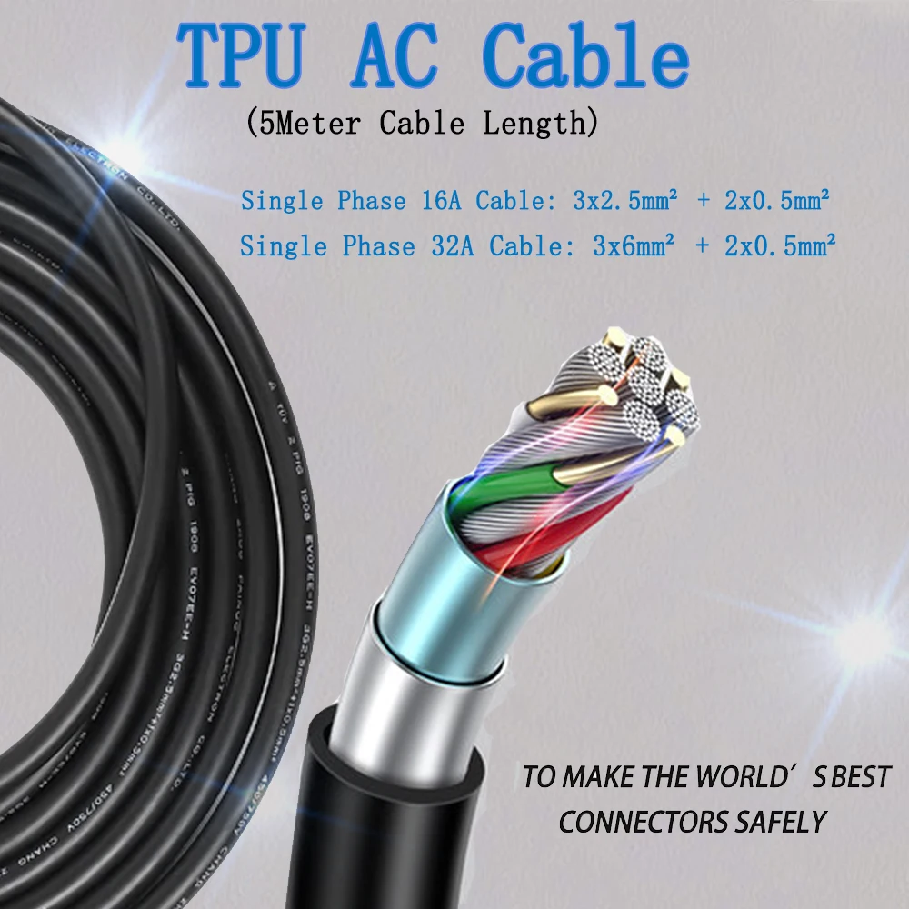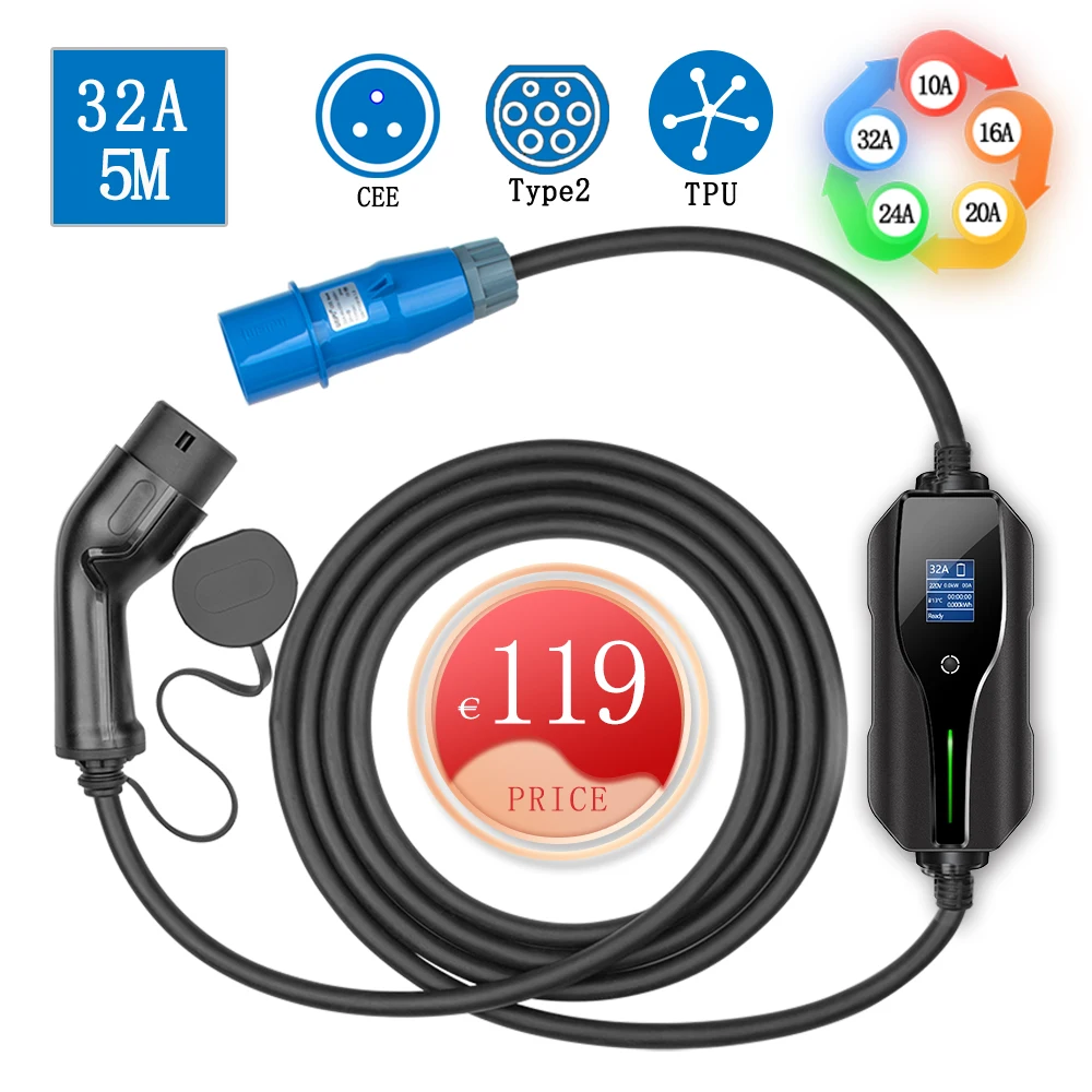 Регулируемое домашнее автомобильное зарядное устройство для электромобиля IEC 62196 Тип 2 32A EV, портативное зарядное устройство 5 метров, зарядный кабель для электромобиля с вилкой CEE