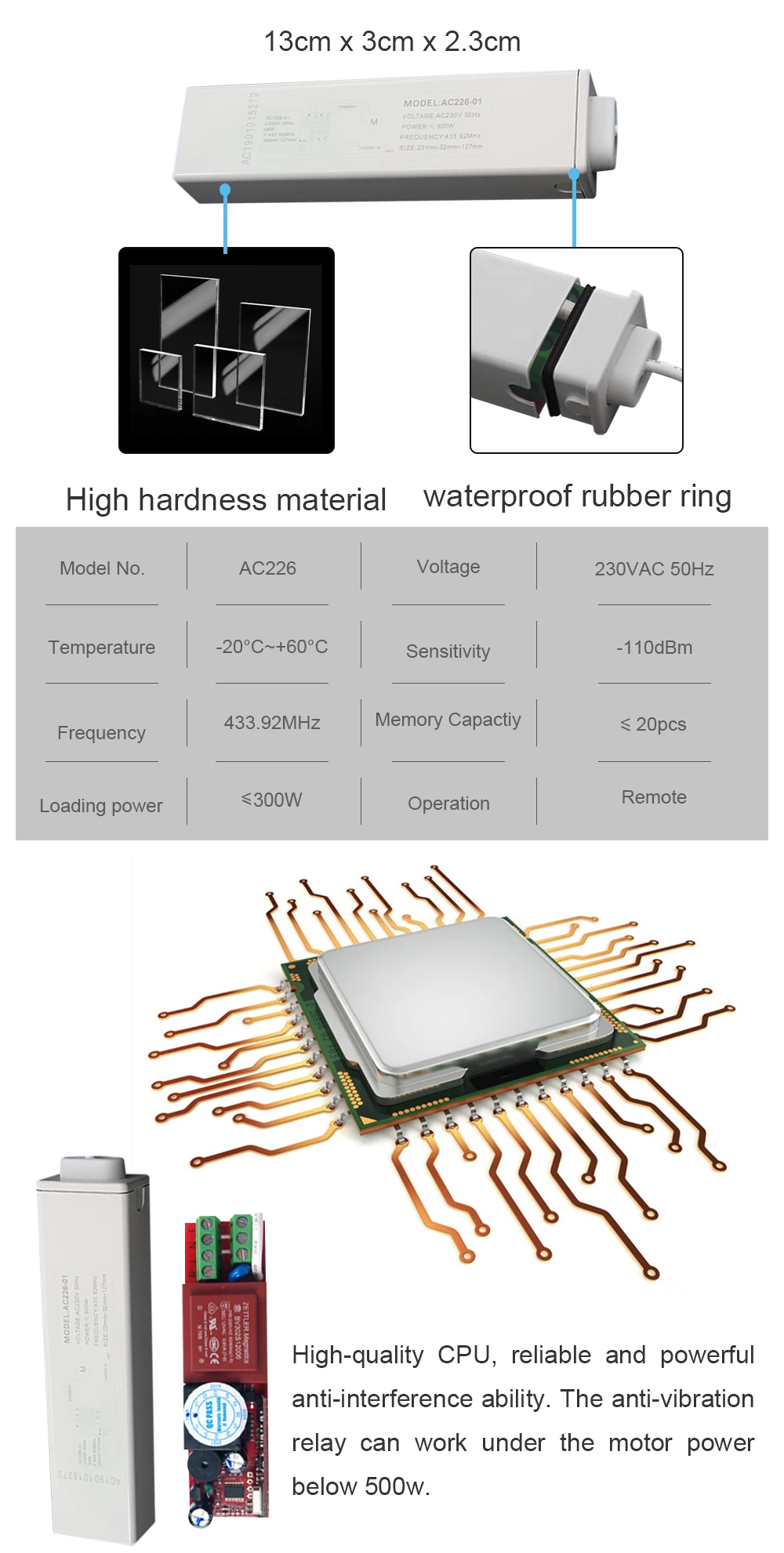 Маленький размер для скрытой установкиПолностью герметичная конструкция с защитой IP65 для наружной установкиJog/linking для легкой резки, точный контроль положения электронных венецианских жалюзиПринятие анти-токовой схемы, подходит для двигателей, мощность которых ниже 500 ВтСтабильная производительность, сильная защита от помехТочный процесс SMT, поверхность влагостойкая,Понижающее решение трансформатора, долговечная стабильность и надежность
