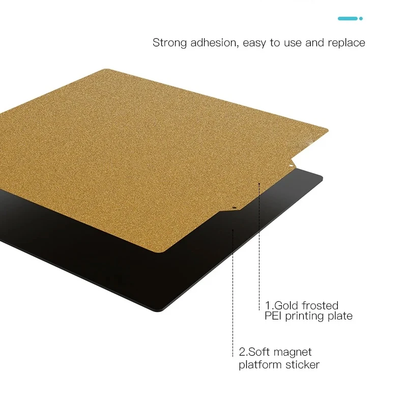 ● Устойчивость к 200 ℃● Два в одном комплекте, Золотой матовый, печатная пластина PEI. И мягкая магнитная наклейка для платформы.