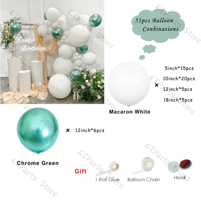 Белый Макарон (5 дюймов * 15 шт., 10 дюймов * 20 шт., 12 дюймов * 5 шт., 18 дюймов * 5 шт.)Хром зеленый 12 дюймов * 6 штБесплатно: рулонный клей * 1(100 шт)Воздушная цепь * 1(5 м)Крючок * 3