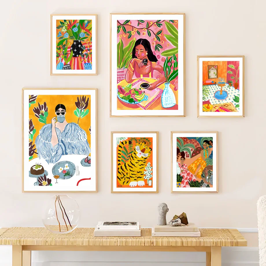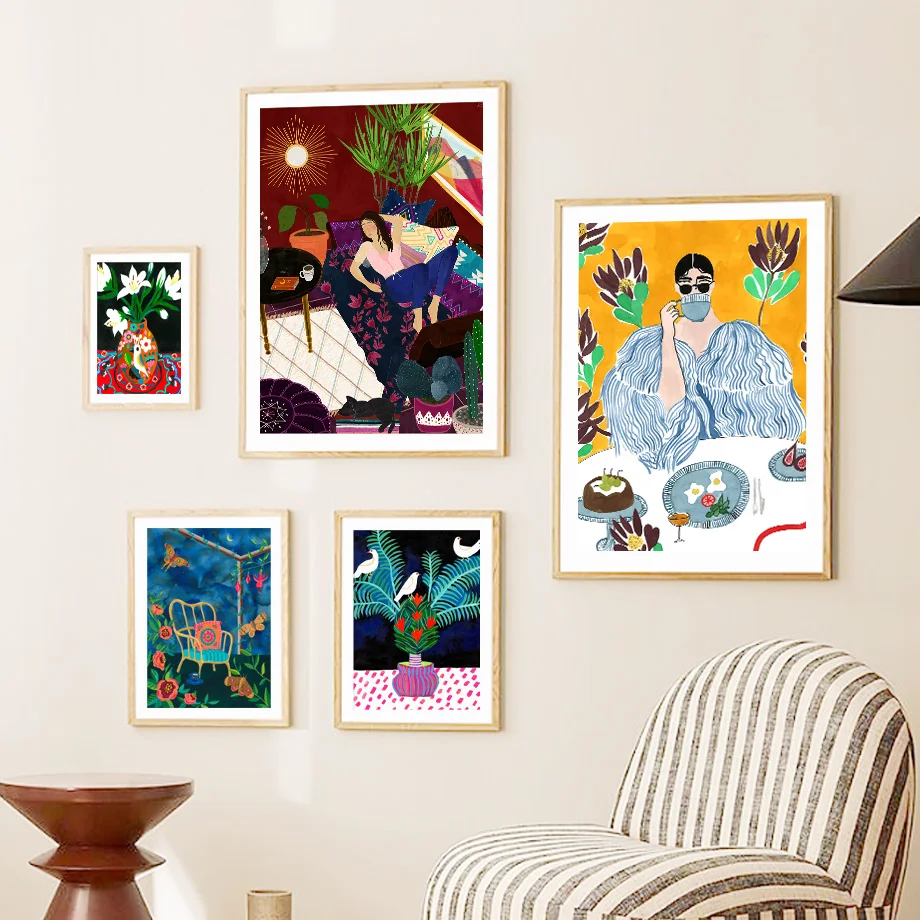 Абстрактные современные постеры и принты красочной выставки девушка...