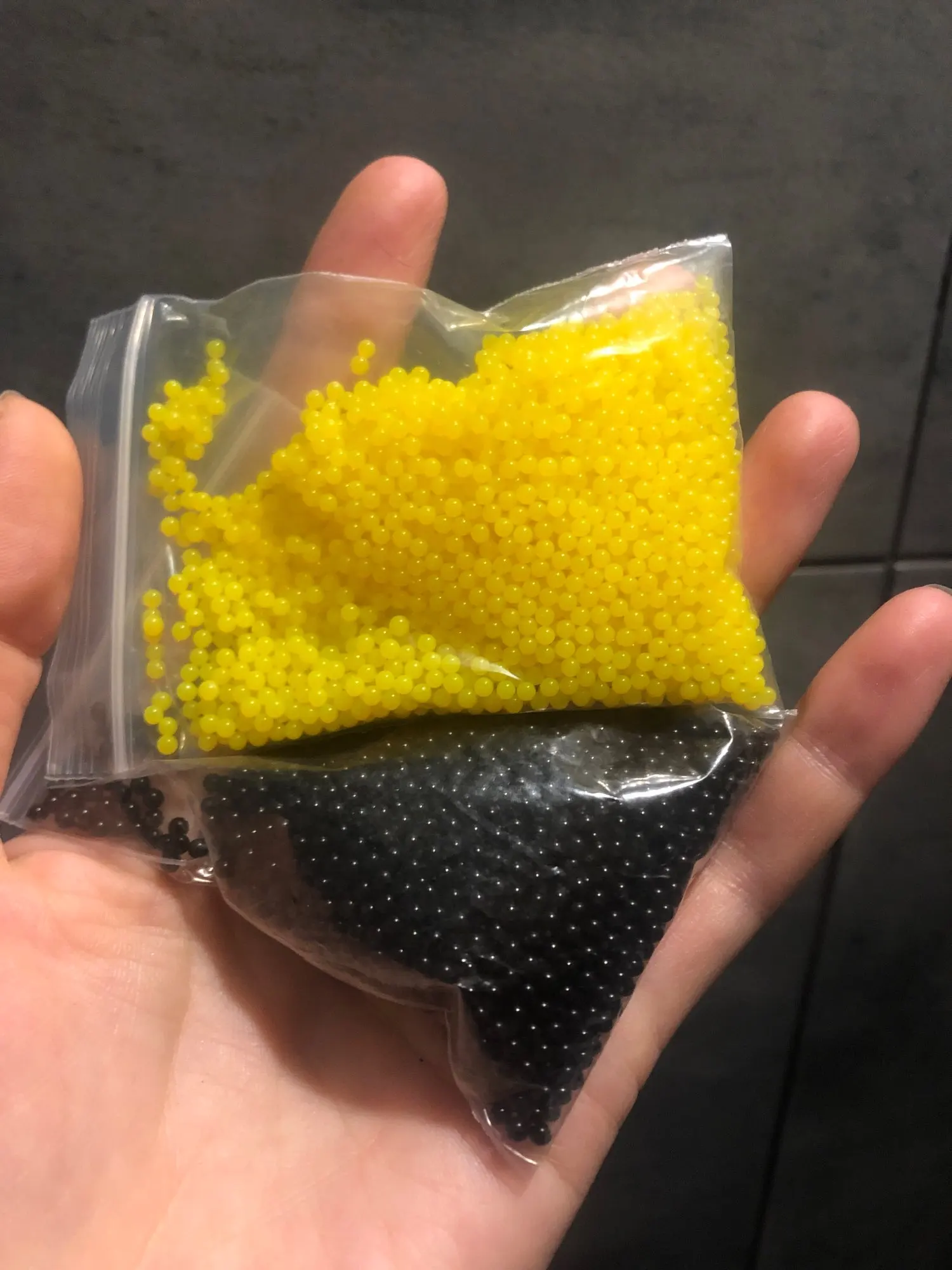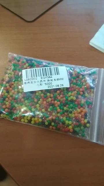 Небольшой пакетик 7*5 см. Сильно сомневаюсь, что в такой объем вмещается 5000 шариков диаметром 1 кв. мм. При впитывании воды увеличиваются примерно до 7мм.
