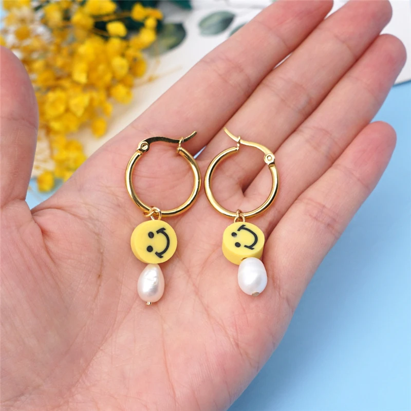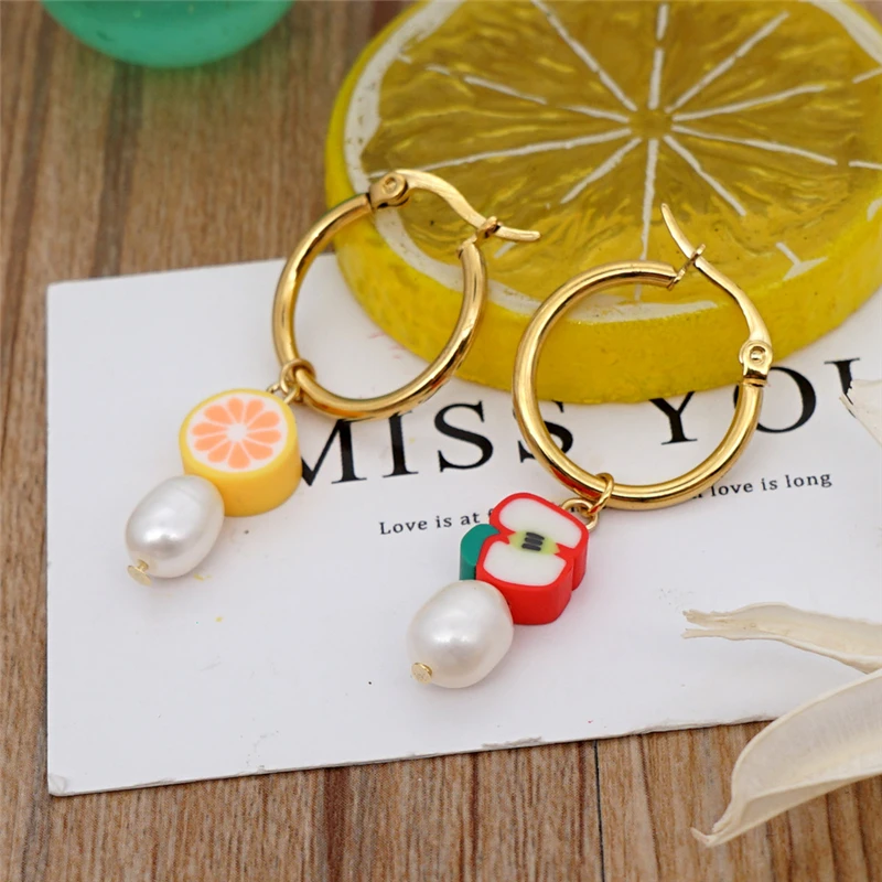 Модные серьги-смайлики из полимерной глины с фруктами, женские Уникальные висячие серьги с пляжным жемчугом, круглые серьги в стиле панк