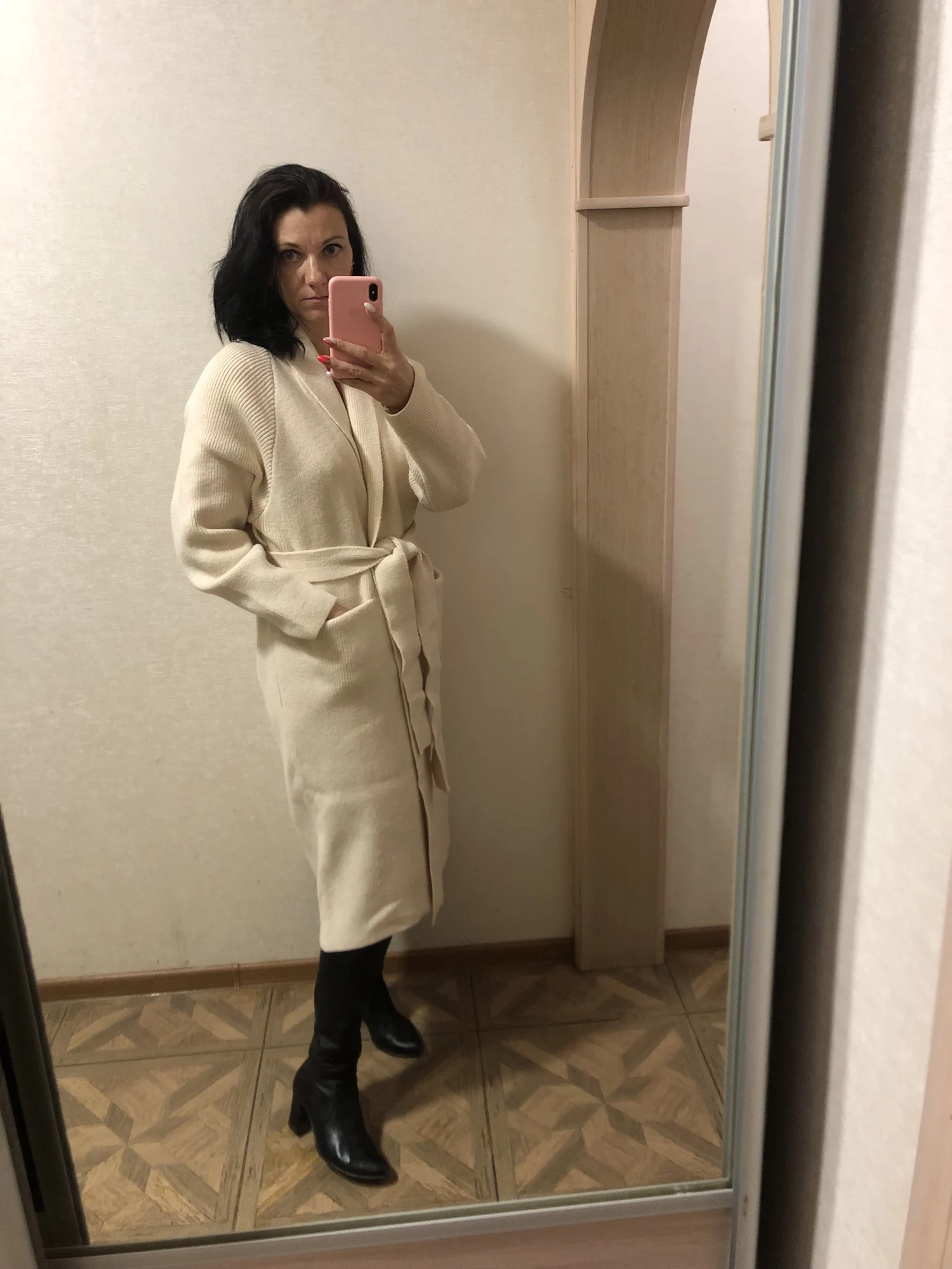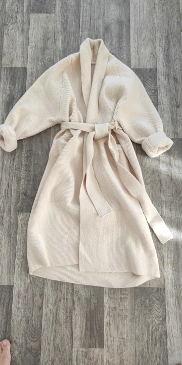 Великолепный кардиган. Теплый и тяжелый. Очень довольна. На 5 фото продавца, отчетливо видно его цвет и фактура. Спасибо большое продавцу, за отличное настроение. На рост 177 см., вес 70 кг., ОГ-96 см., ОТ- 78 см., ОБ-102 см., смотрится супер. На 20 см. ниже колен. Рукав подвернула на 5 см. Единственное, шлевки для пояса пришиты прямо под рукавом, но это не существенная мелочь. Карманы, для моего роста, именно там, где они и должны быть.