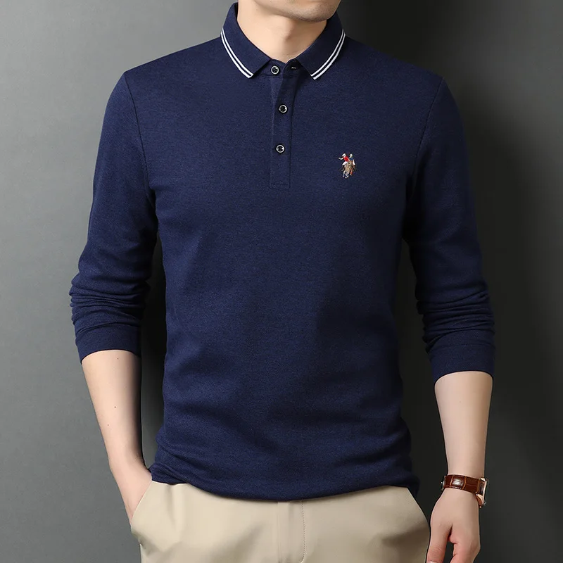 Рубашка-поло мужская в черную полоску, повседневная, с длинным рукавом